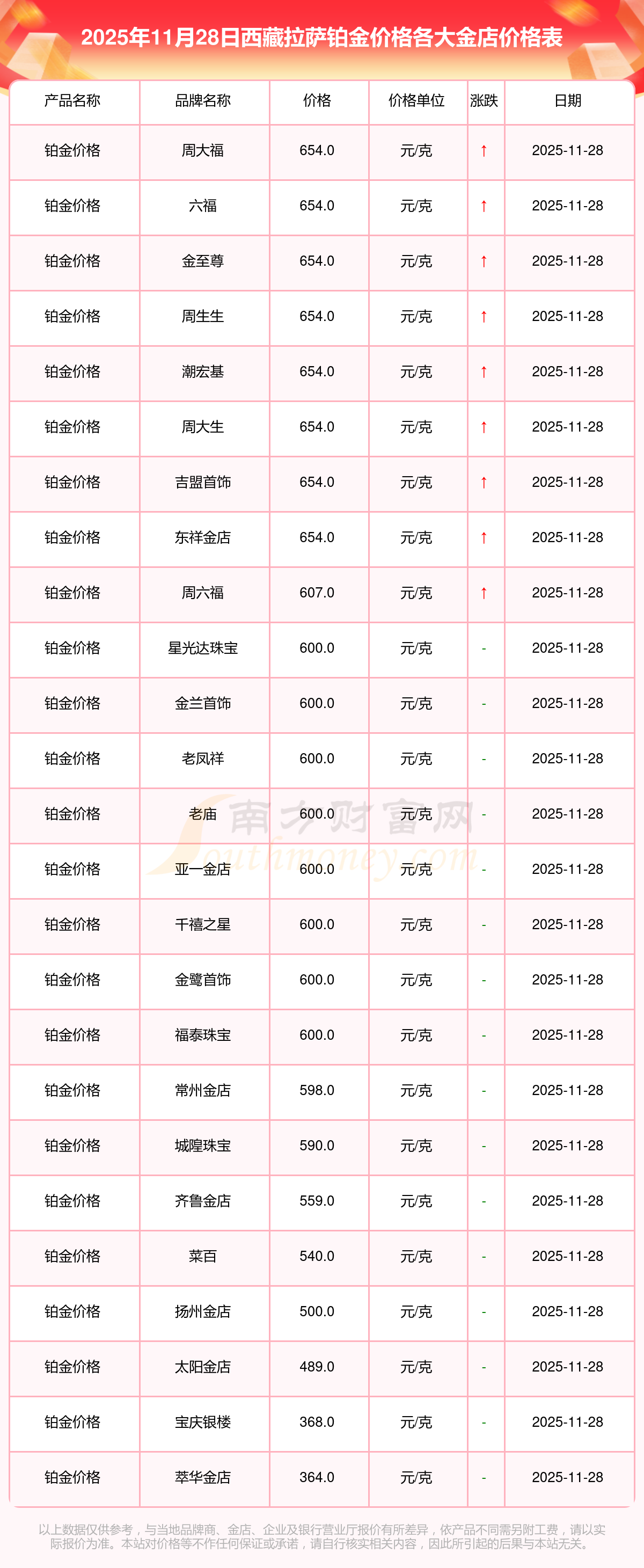 二、2025年11月28日今日西藏拉薩各金店鉑金價格實時行情匯總