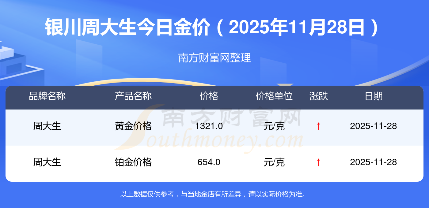 2025年11月28日銀川周大生一克黃金對應(yīng)的價格是多少?黃金價格1321.0元/克,鉑金價格600.0元/克,銀條價格12.6元/克,黃金價格1321.0元/克,鉑金價格600.0元/克,金條價格(內(nèi)地)1207.0元/克,金飾價格(內(nèi)地)1321.0元/克,黃金飾品(香港)46370.0,鉑金飾品(香港)13970.0,金條金價(香港)41860.0,投資金條1296.0元/克。