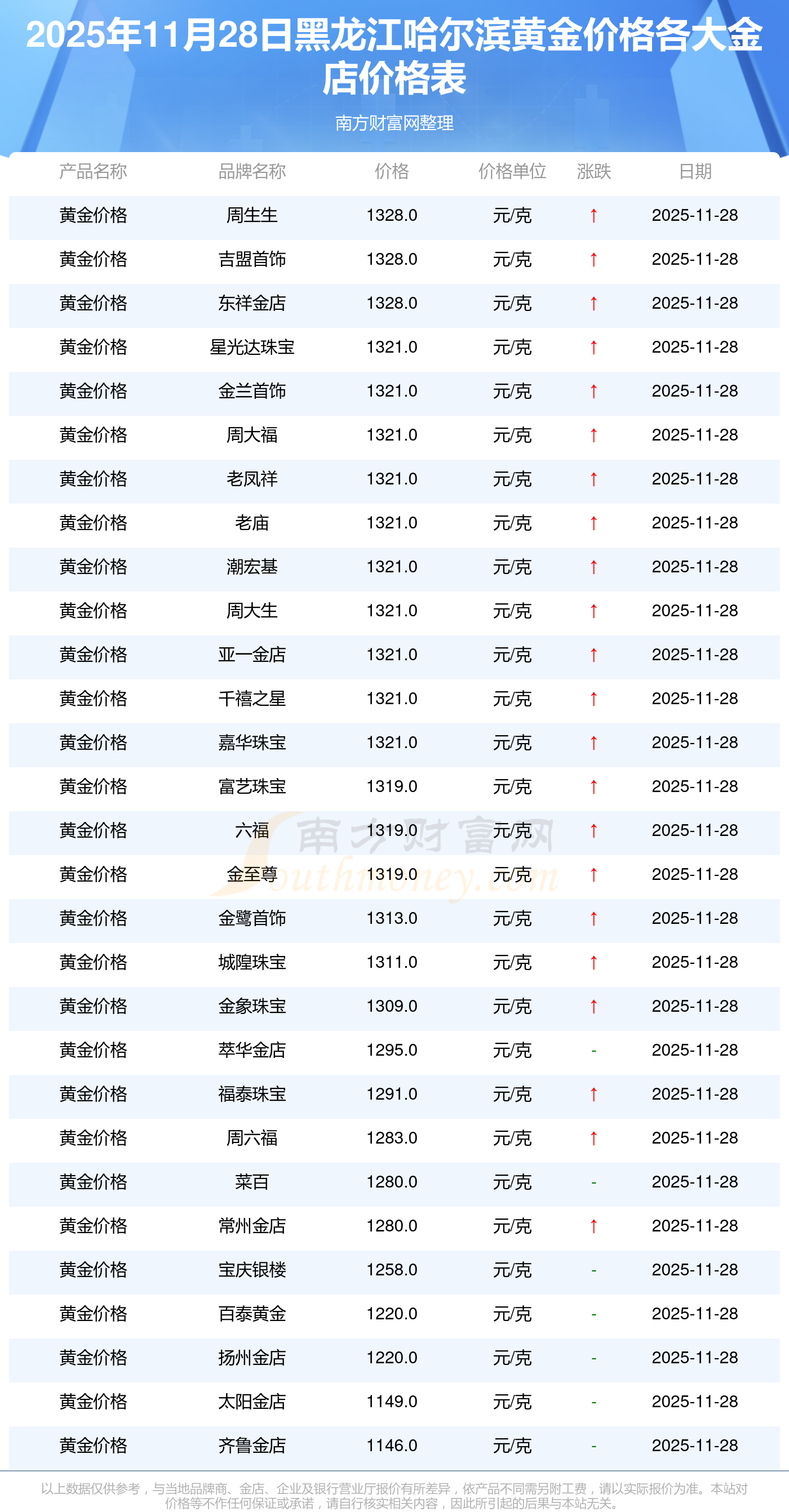 2025年11月28日,黑龍江哈爾濱星光達珠寶、星光達珠寶、寶泉錢幣、金蘭首飾、金蘭首飾、謝瑞麟、謝瑞麟、謝瑞麟、謝瑞麟、謝瑞麟、金銀街等各大金店品牌黃金價格今日價格行情最新來了:星光達珠寶1321.0元/克、星光達珠寶600.0元/克、寶泉錢幣12.6元/克、金蘭首飾1321.0元/克、金蘭首飾600.0元/克、謝瑞麟1207.0元/克、謝瑞麟1321.0元/克、謝瑞麟46370.0、謝瑞麟13970.0、謝瑞麟41860.0、金銀街1296.0元/克。