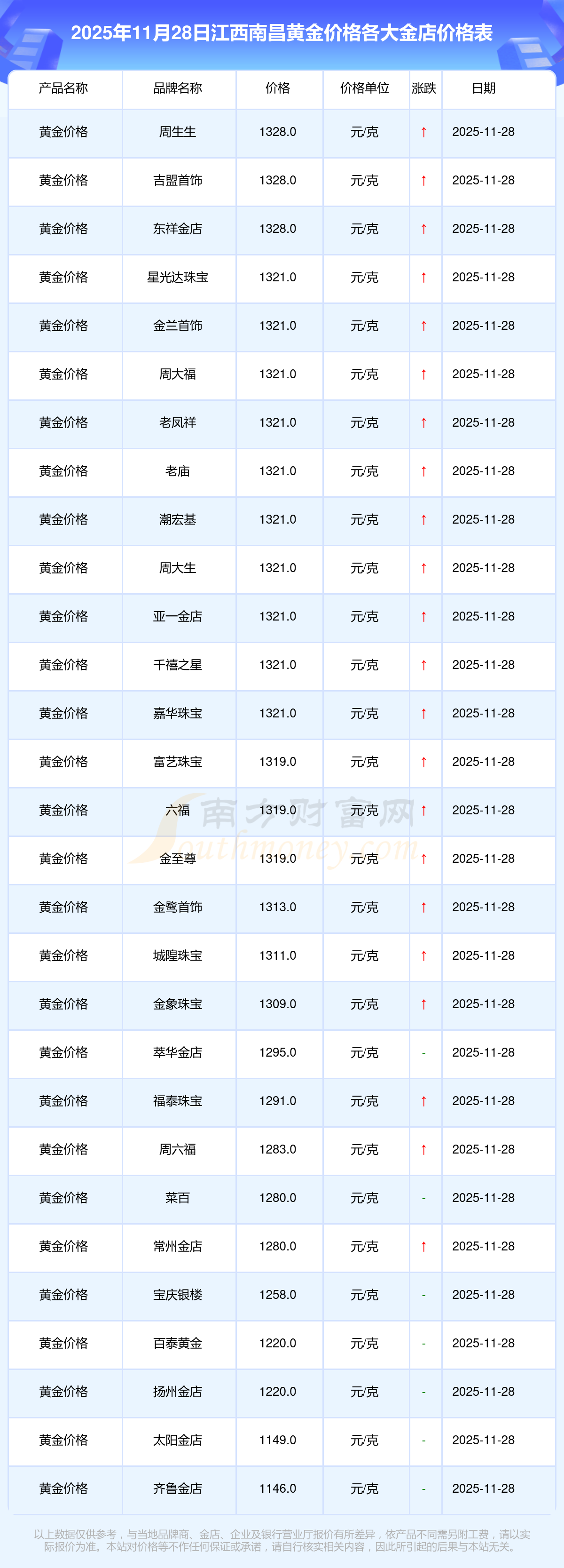 2025年11月28日,江西南昌星光達(dá)珠寶、星光達(dá)珠寶、寶泉錢(qián)幣、金蘭首飾、金蘭首飾、謝瑞麟、謝瑞麟、謝瑞麟、謝瑞麟、謝瑞麟、金銀街等各大金店品牌黃金價(jià)格今日價(jià)格行情最新來(lái)了:星光達(dá)珠寶1321.0元/克、星光達(dá)珠寶600.0元/克、寶泉錢(qián)幣12.6元/克、金蘭首飾1321.0元/克、金蘭首飾600.0元/克、謝瑞麟1207.0元/克、謝瑞麟1321.0元/克、謝瑞麟46370.0、謝瑞麟13970.0、謝瑞麟41860.0、金銀街1296.0元/克。