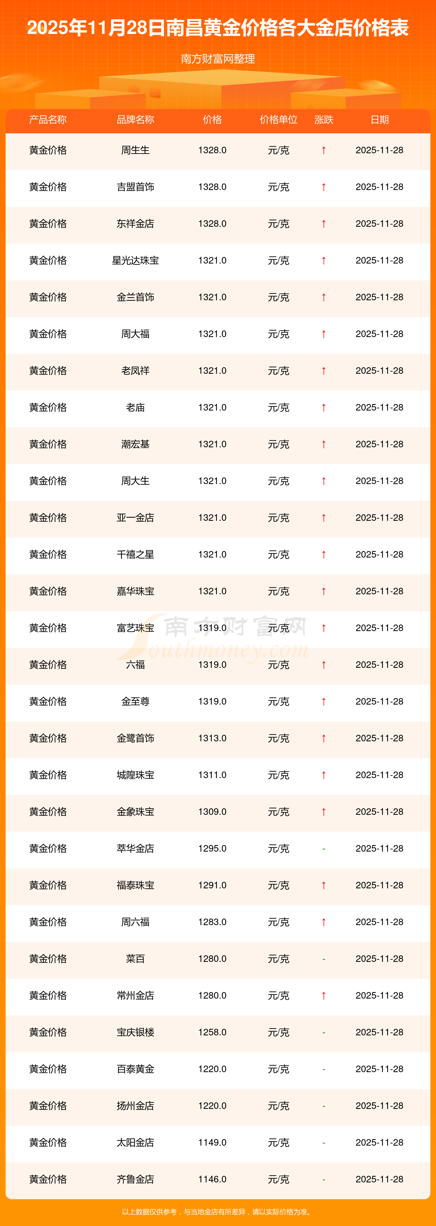 今天是2025年11月28日,南昌星光達珠寶、星光達珠寶、寶泉錢幣、金蘭首飾、金蘭首飾、謝瑞麟、謝瑞麟、謝瑞麟、謝瑞麟、謝瑞麟、金銀街等各大金店品牌黃金價格最新價格如下:星光達珠寶1321.0元/克、星光達珠寶600.0元/克、寶泉錢幣12.6元/克、金蘭首飾1321.0元/克、金蘭首飾600.0元/克、謝瑞麟1207.0元/克、謝瑞麟1321.0元/克、謝瑞麟46370.0、謝瑞麟13970.0、謝瑞麟41860.0、金銀街1296.0元/克。