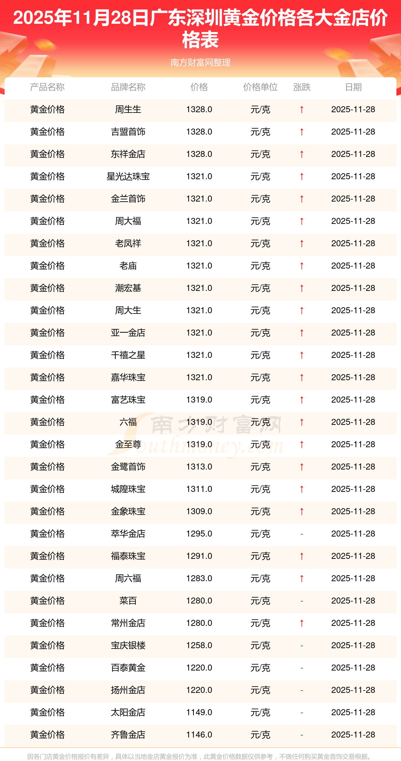 2025年11月28日,廣東深圳星光達(dá)珠寶、星光達(dá)珠寶、寶泉錢(qián)幣、金蘭首飾、金蘭首飾、謝瑞麟、謝瑞麟、謝瑞麟、謝瑞麟、謝瑞麟、金銀街等各大金店品牌黃金價(jià)格今日價(jià)格如下:星光達(dá)珠寶1321.0元/克、星光達(dá)珠寶600.0元/克、寶泉錢(qián)幣12.6元/克、金蘭首飾1321.0元/克、金蘭首飾600.0元/克、謝瑞麟1207.0元/克、謝瑞麟1321.0元/克、謝瑞麟46370.0、謝瑞麟13970.0、謝瑞麟41860.0、金銀街1296.0元/克。