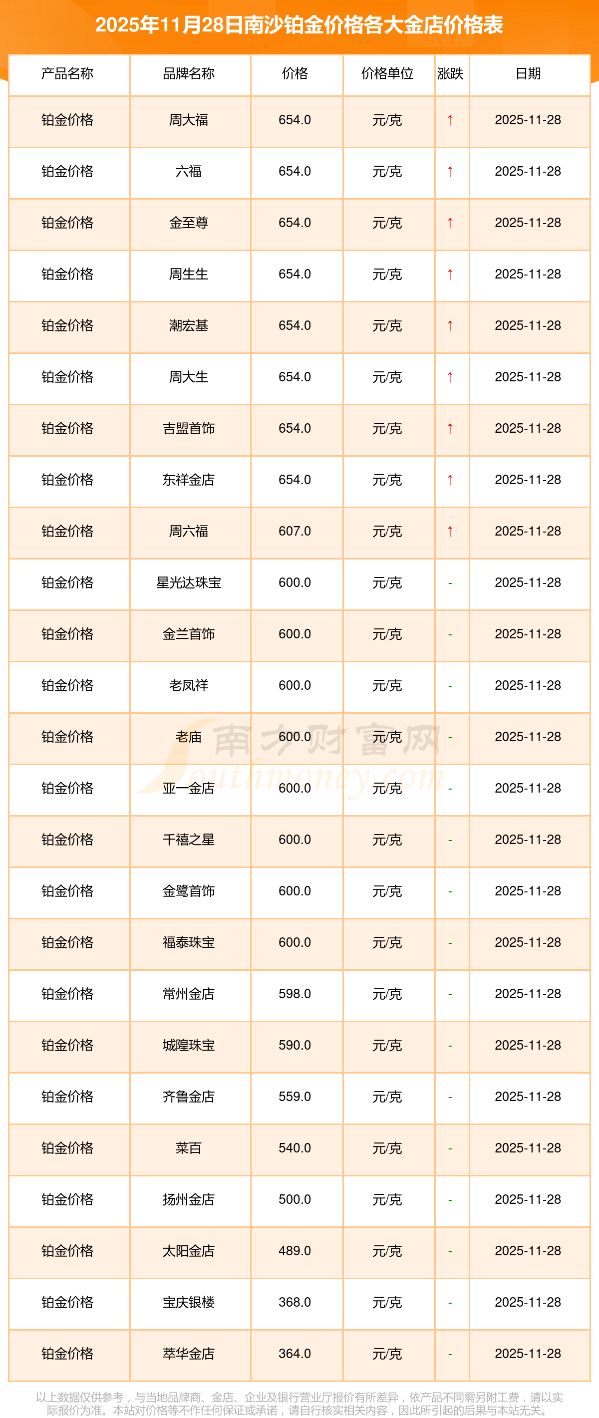 2025年11月28日,南沙星光達(dá)珠寶、星光達(dá)珠寶、寶泉錢幣、金蘭首飾、金蘭首飾、謝瑞麟、謝瑞麟、謝瑞麟、謝瑞麟、謝瑞麟、金銀街等各大金店品牌鉑金價(jià)格今日價(jià)格行情最新來(lái)了:星光達(dá)珠寶1321.0元/克、星光達(dá)珠寶600.0元/克、寶泉錢幣12.6元/克、金蘭首飾1321.0元/克、金蘭首飾600.0元/克、謝瑞麟1207.0元/克、謝瑞麟1321.0元/克、謝瑞麟46370.0、謝瑞麟13970.0、謝瑞麟41860.0、金銀街1296.0元/克。