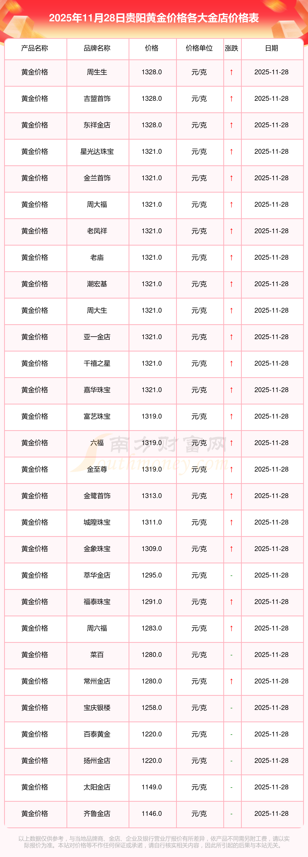 2025年11月28日貴陽(yáng)星光達(dá)珠寶、星光達(dá)珠寶、寶泉錢(qián)幣、金蘭首飾、金蘭首飾、謝瑞麟、謝瑞麟、謝瑞麟、謝瑞麟、謝瑞麟、金銀街等各大金店品牌黃金價(jià)格最新價(jià)格行情來(lái)了,如下:星光達(dá)珠寶黃金價(jià)格1321.0元/克,星光達(dá)珠寶鉑金價(jià)格600.0元/克,寶泉錢(qián)幣銀條價(jià)格12.6元/克,金蘭首飾黃金價(jià)格1321.0元/克,金蘭首飾鉑金價(jià)格600.0元/克,謝瑞麟金條價(jià)格(內(nèi)地)1207.0元/克,謝瑞麟金飾價(jià)格(內(nèi)地)1321.0元/克,謝瑞麟黃金飾品(香港)46370.0,謝瑞麟鉑金飾品(香港)13970.0,謝瑞麟金條金價(jià)(香港)41860.0,金銀街投資金條1296.0元/克。