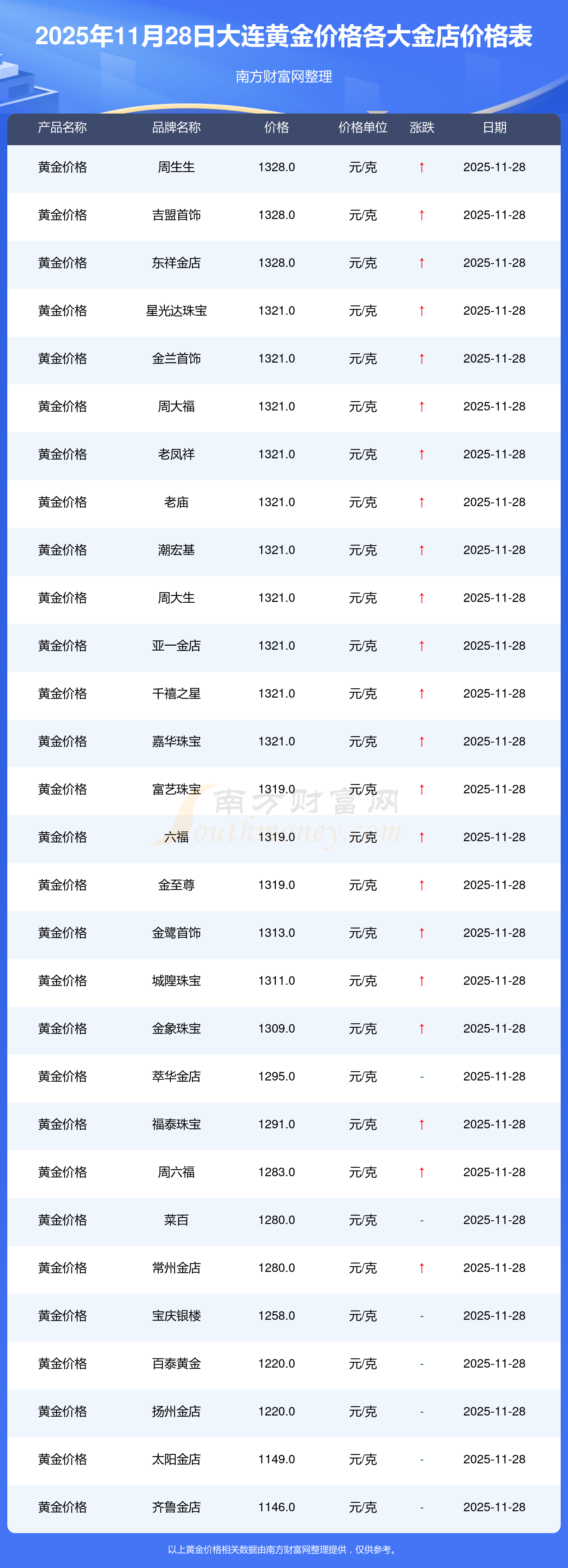 2025年11月28日大連各金店黃金價(jià)格是多少錢一克?各金店黃金價(jià)格表