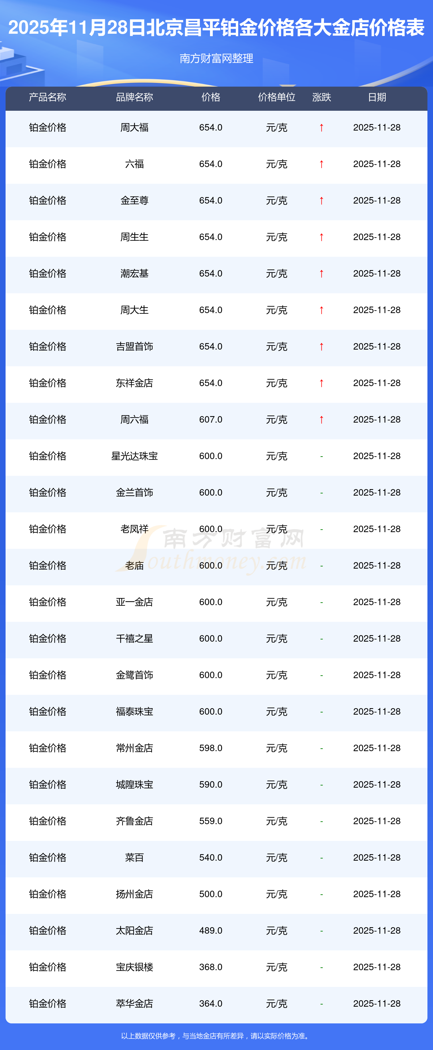 2025年11月28日北京昌平星光達(dá)珠寶、星光達(dá)珠寶、寶泉錢幣、金蘭首飾、金蘭首飾、謝瑞麟、謝瑞麟、謝瑞麟、謝瑞麟、謝瑞麟、金銀街等各大金店品牌鉑金價格最新價格行情來了,如下:星光達(dá)珠寶黃金價格1321.0元/克,星光達(dá)珠寶鉑金價格600.0元/克,寶泉錢幣銀條價格12.6元/克,金蘭首飾黃金價格1321.0元/克,金蘭首飾鉑金價格600.0元/克,謝瑞麟金條價格(內(nèi)地)1207.0元/克,謝瑞麟金飾價格(內(nèi)地)1321.0元/克,謝瑞麟黃金飾品(香港)46370.0,謝瑞麟鉑金飾品(香港)13970.0,謝瑞麟金條金價(香港)41860.0,金銀街投資金條1296.0元/克。