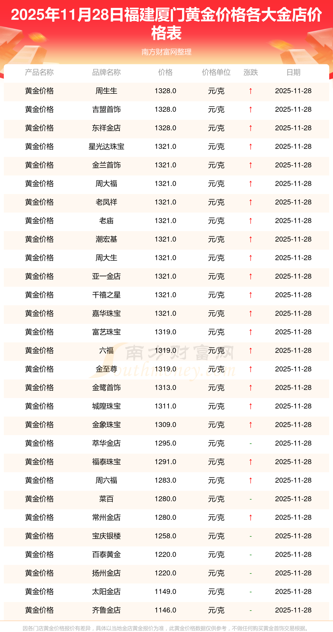 2025年11月28日福建廈門各大金店黃金價(jià)格最新價(jià)格:星光達(dá)珠寶1321.0元/克,星光達(dá)珠寶600.0元/克,寶泉錢幣12.6元/克,金蘭首飾1321.0元/克,金蘭首飾600.0元/克,謝瑞麟1207.0元/克,謝瑞麟1321.0元/克,謝瑞麟46370.0,謝瑞麟13970.0,謝瑞麟41860.0,金銀街1296.0元/克。