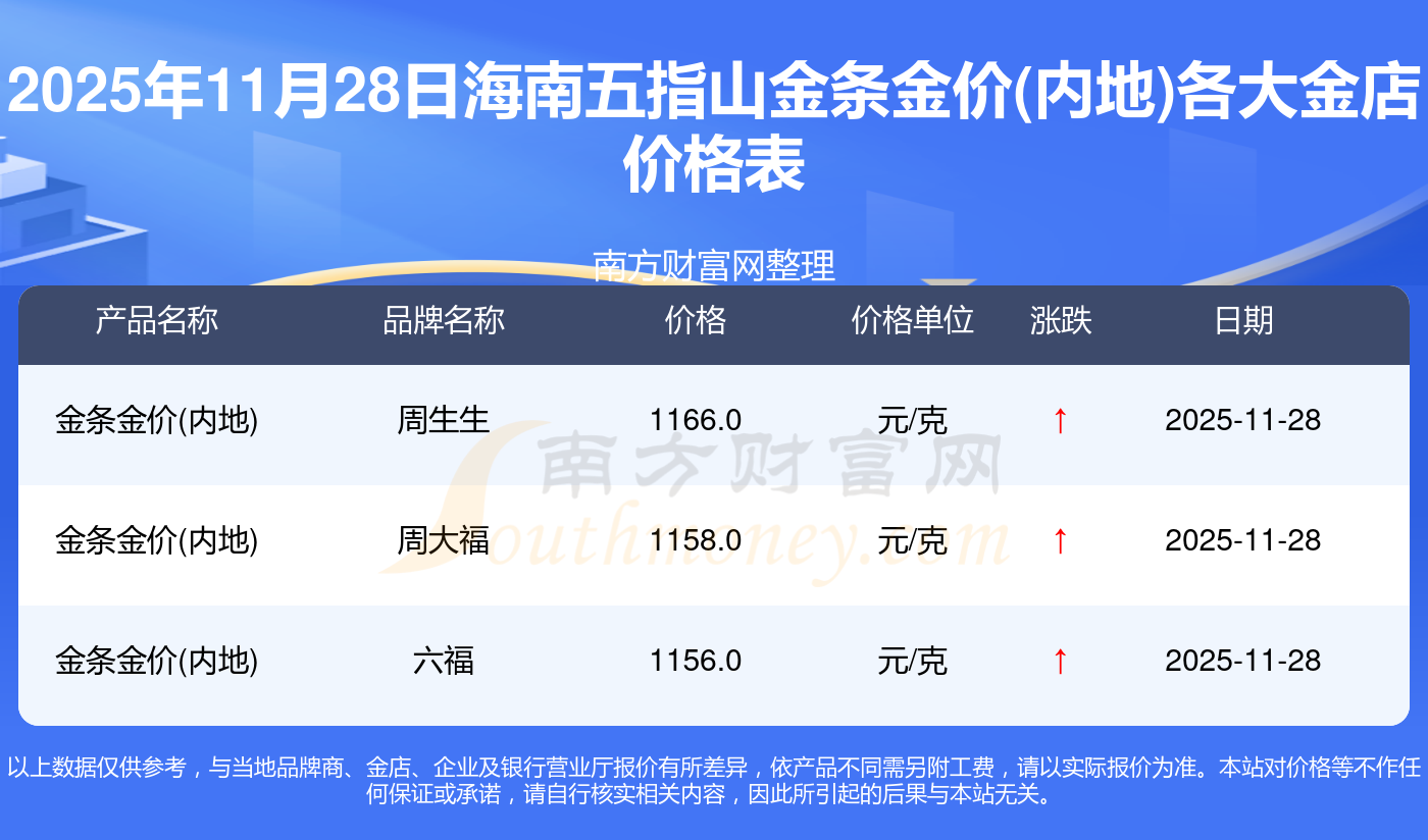 2025年11月28日,海南五指山星光達珠寶、星光達珠寶、寶泉錢幣、金蘭首飾、金蘭首飾、謝瑞麟、謝瑞麟、謝瑞麟、謝瑞麟、謝瑞麟、金銀街等各大金店品牌金條金價(內(nèi)地)今日價格如下:星光達珠寶1321.0元/克、星光達珠寶600.0元/克、寶泉錢幣12.6元/克、金蘭首飾1321.0元/克、金蘭首飾600.0元/克、謝瑞麟1207.0元/克、謝瑞麟1321.0元/克、謝瑞麟46370.0、謝瑞麟13970.0、謝瑞麟41860.0、金銀街1296.0元/克。