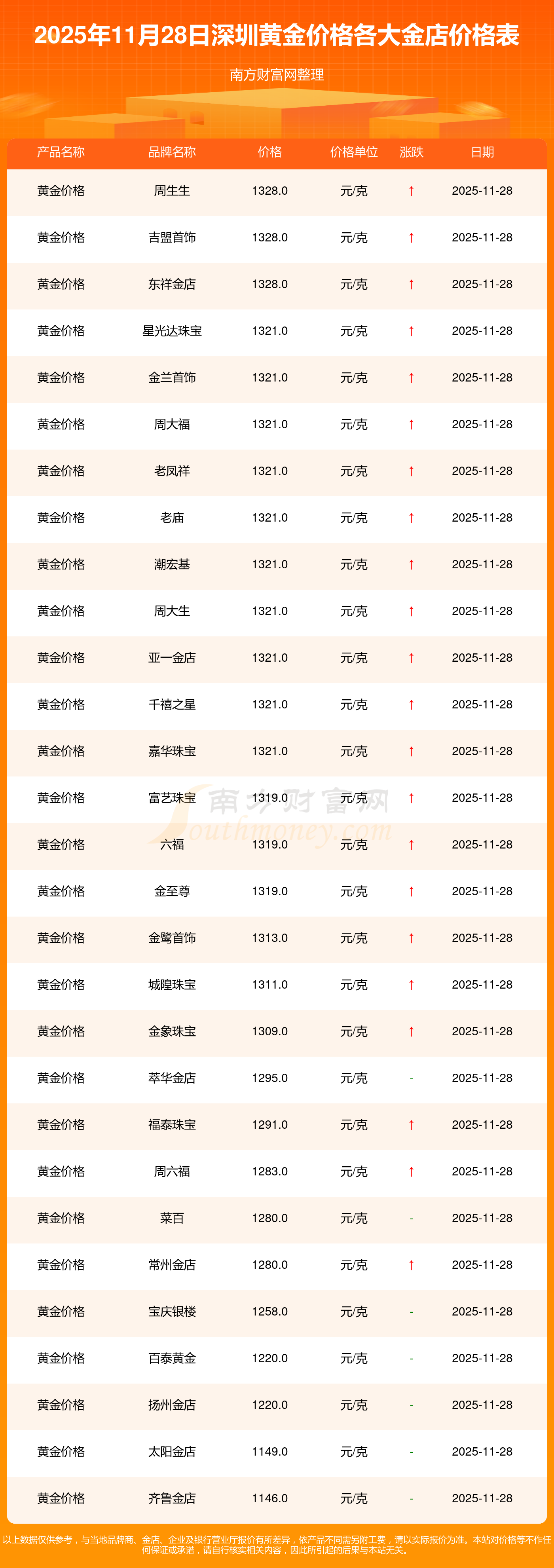 今天是2025年11月28日,深圳星光達(dá)珠寶、星光達(dá)珠寶、寶泉錢幣、金蘭首飾、金蘭首飾、謝瑞麟、謝瑞麟、謝瑞麟、謝瑞麟、謝瑞麟、金銀街等各大金店品牌黃金價(jià)格最新價(jià)格如下:星光達(dá)珠寶1321.0元/克、星光達(dá)珠寶600.0元/克、寶泉錢幣12.6元/克、金蘭首飾1321.0元/克、金蘭首飾600.0元/克、謝瑞麟1207.0元/克、謝瑞麟1321.0元/克、謝瑞麟46370.0、謝瑞麟13970.0、謝瑞麟41860.0、金銀街1296.0元/克。