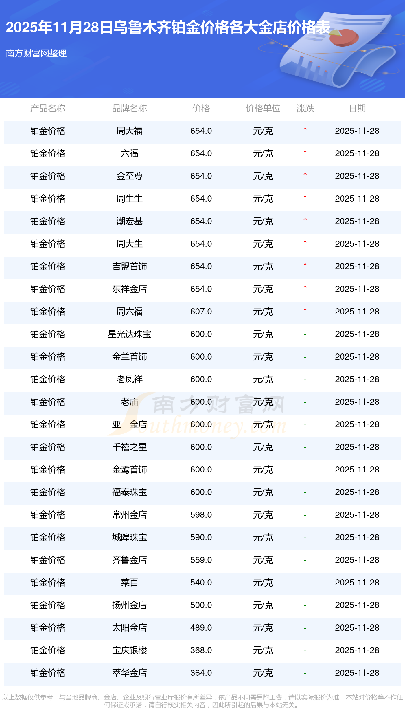 2025年11月28日,烏魯木齊星光達(dá)珠寶、星光達(dá)珠寶、寶泉錢幣、金蘭首飾、金蘭首飾、謝瑞麟、謝瑞麟、謝瑞麟、謝瑞麟、謝瑞麟、金銀街等各大金店品牌鉑金價格今日價格行情最新來了:星光達(dá)珠寶1321.0元/克、星光達(dá)珠寶600.0元/克、寶泉錢幣12.6元/克、金蘭首飾1321.0元/克、金蘭首飾600.0元/克、謝瑞麟1207.0元/克、謝瑞麟1321.0元/克、謝瑞麟46370.0、謝瑞麟13970.0、謝瑞麟41860.0、金銀街1296.0元/克。