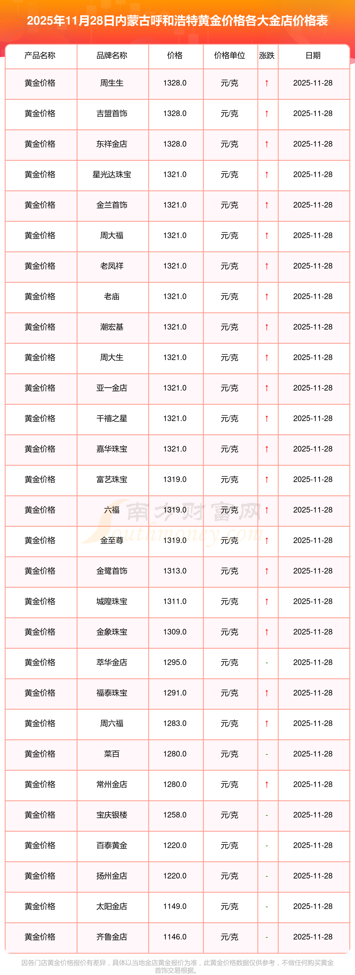2025年11月28日內(nèi)蒙古呼和浩特星光達(dá)珠寶、星光達(dá)珠寶、寶泉錢幣、金蘭首飾、金蘭首飾、謝瑞麟、謝瑞麟、謝瑞麟、謝瑞麟、謝瑞麟、金銀街等各大金店品牌黃金價(jià)格最新價(jià)格如下:星光達(dá)珠寶黃金價(jià)格1321.0元/克,星光達(dá)珠寶鉑金價(jià)格600.0元/克,寶泉錢幣銀條價(jià)格12.6元/克,金蘭首飾黃金價(jià)格1321.0元/克,金蘭首飾鉑金價(jià)格600.0元/克,謝瑞麟金條價(jià)格(內(nèi)地)1207.0元/克,謝瑞麟金飾價(jià)格(內(nèi)地)1321.0元/克,謝瑞麟黃金飾品(香港)46370.0,謝瑞麟鉑金飾品(香港)13970.0,謝瑞麟金條金價(jià)(香港)41860.0,金銀街投資金條1296.0元/克。