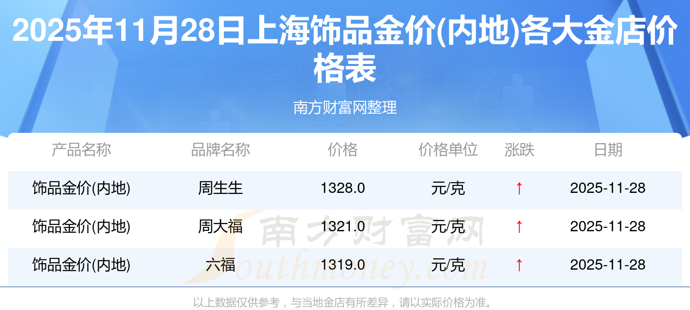 2025年11月28日上海星光達(dá)珠寶、星光達(dá)珠寶、寶泉錢幣、金蘭首飾、金蘭首飾、謝瑞麟、謝瑞麟、謝瑞麟、謝瑞麟、謝瑞麟、金銀街等各大金店品牌飾品金價(內(nèi)地)最新價格行情來了,如下:星光達(dá)珠寶黃金價格1321.0元/克,星光達(dá)珠寶鉑金價格600.0元/克,寶泉錢幣銀條價格12.6元/克,金蘭首飾黃金價格1321.0元/克,金蘭首飾鉑金價格600.0元/克,謝瑞麟金條價格(內(nèi)地)1207.0元/克,謝瑞麟金飾價格(內(nèi)地)1321.0元/克,謝瑞麟黃金飾品(香港)46370.0,謝瑞麟鉑金飾品(香港)13970.0,謝瑞麟金條金價(香港)41860.0,金銀街投資金條1296.0元/克。