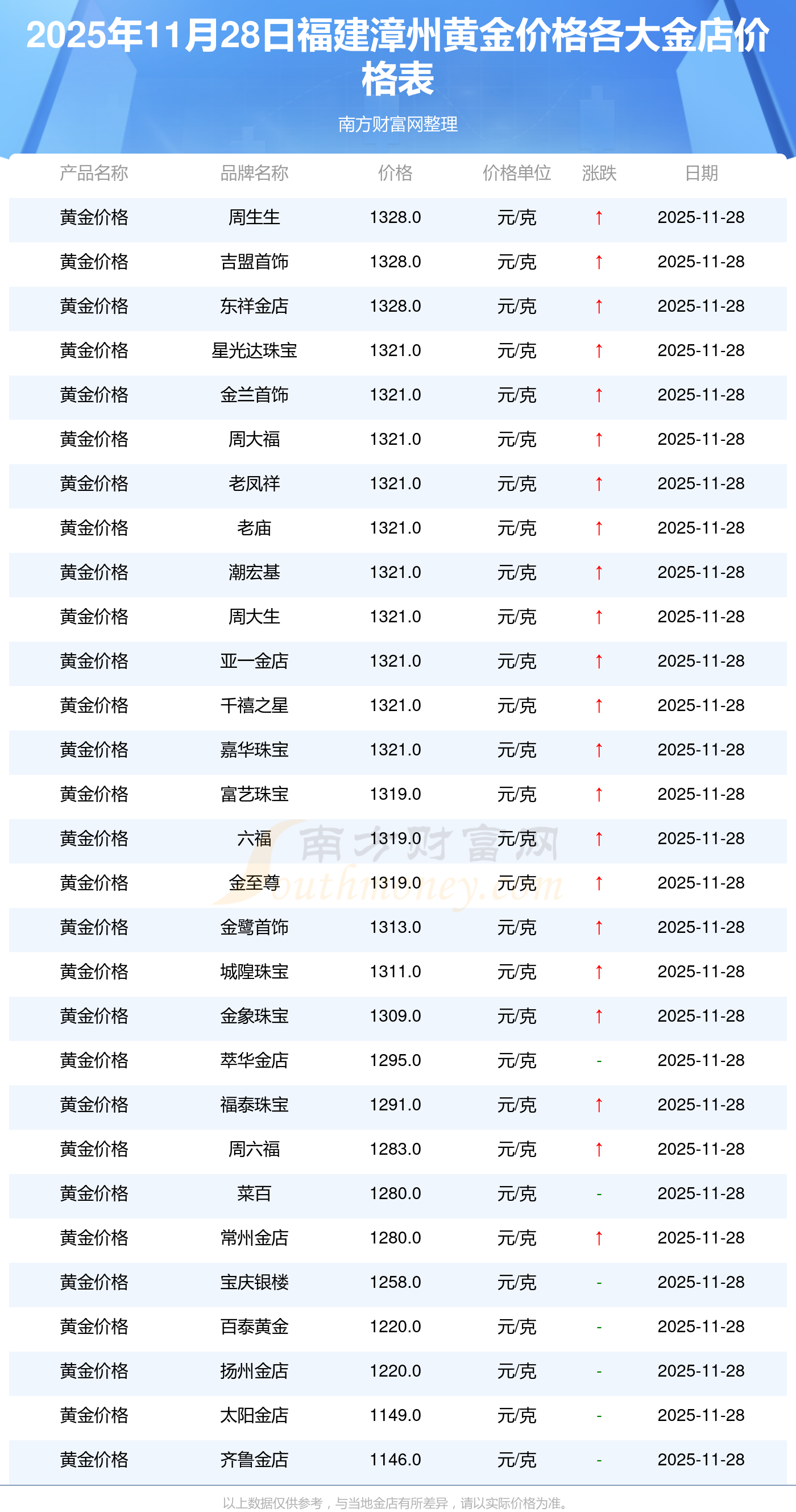 2025年11月28日福建漳州各大金店黃金價(jià)格最新價(jià)格查詢(xún)來(lái)了:星光達(dá)珠寶1321.0元/克,星光達(dá)珠寶600.0元/克,寶泉錢(qián)幣12.6元/克,金蘭首飾1321.0元/克,金蘭首飾600.0元/克,謝瑞麟1207.0元/克,謝瑞麟1321.0元/克,謝瑞麟46370.0,謝瑞麟13970.0,謝瑞麟41860.0,金銀街1296.0元/克。