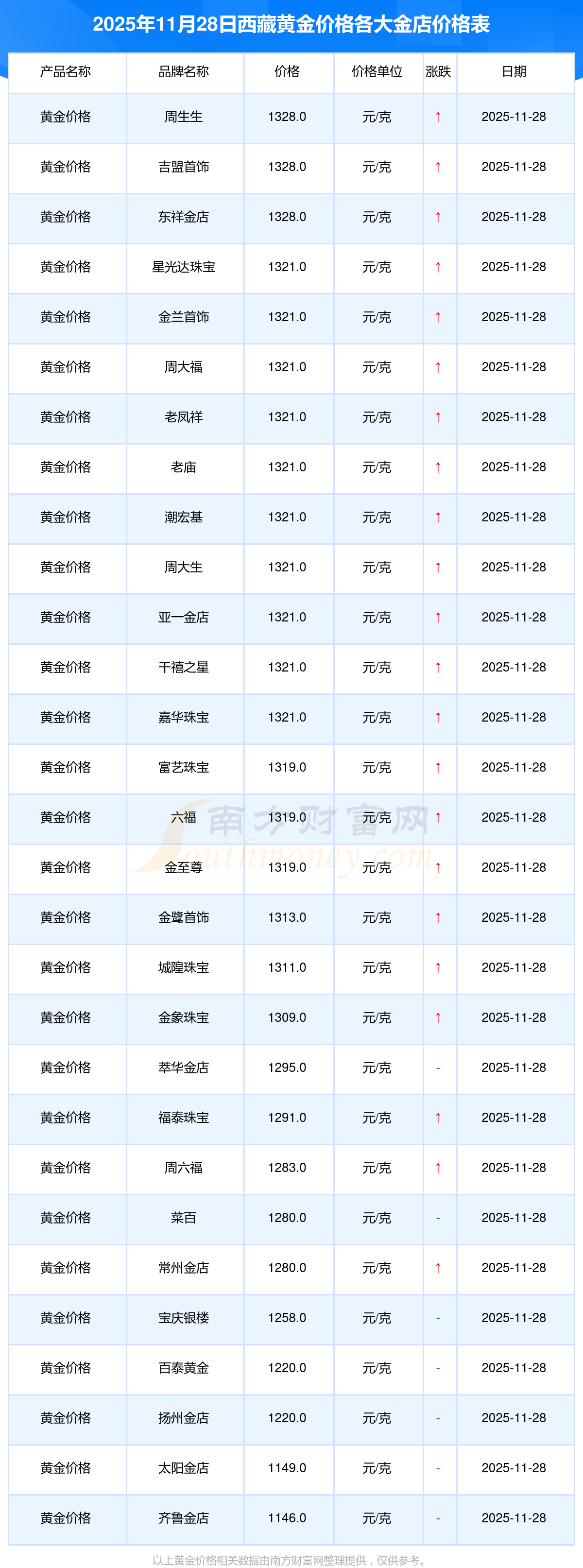 2025年11月28日,西藏星光達(dá)珠寶、星光達(dá)珠寶、寶泉錢幣、金蘭首飾、金蘭首飾、謝瑞麟、謝瑞麟、謝瑞麟、謝瑞麟、謝瑞麟、金銀街等各大金店品牌黃金價(jià)格今日價(jià)格如下:星光達(dá)珠寶1321.0元/克、星光達(dá)珠寶600.0元/克、寶泉錢幣12.6元/克、金蘭首飾1321.0元/克、金蘭首飾600.0元/克、謝瑞麟1207.0元/克、謝瑞麟1321.0元/克、謝瑞麟46370.0、謝瑞麟13970.0、謝瑞麟41860.0、金銀街1296.0元/克。