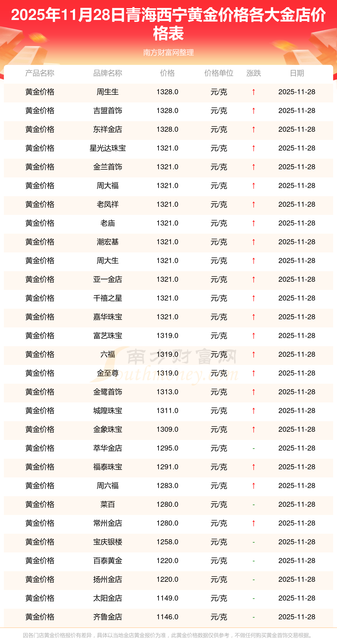 今天是2025年11月28日,青海西寧星光達(dá)珠寶、星光達(dá)珠寶、寶泉錢幣、金蘭首飾、金蘭首飾、謝瑞麟、謝瑞麟、謝瑞麟、謝瑞麟、謝瑞麟、金銀街等各大金店品牌黃金價(jià)格最新價(jià)格行情是這樣的:星光達(dá)珠寶1321.0元/克、星光達(dá)珠寶600.0元/克、寶泉錢幣12.6元/克、金蘭首飾1321.0元/克、金蘭首飾600.0元/克、謝瑞麟1207.0元/克、謝瑞麟1321.0元/克、謝瑞麟46370.0、謝瑞麟13970.0、謝瑞麟41860.0、金銀街1296.0元/克。
