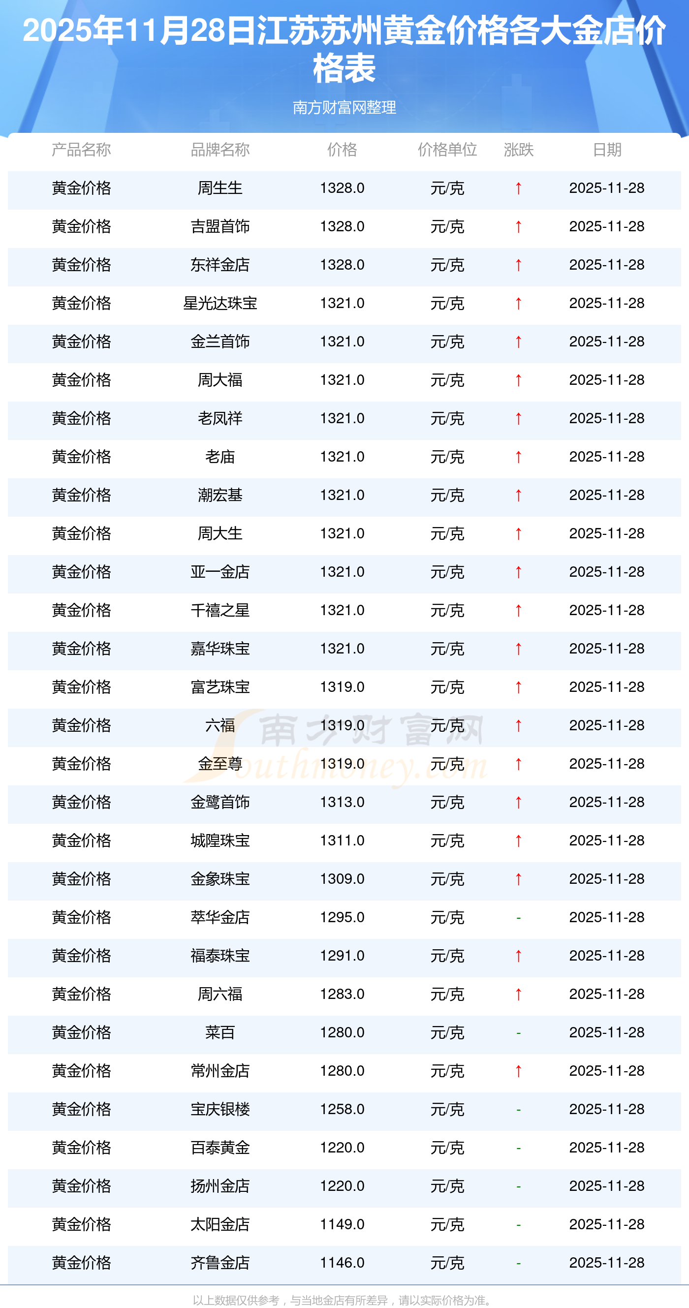 今天是2025年11月28日,江蘇蘇州星光達(dá)珠寶、星光達(dá)珠寶、寶泉錢幣、金蘭首飾、金蘭首飾、謝瑞麟、謝瑞麟、謝瑞麟、謝瑞麟、謝瑞麟、金銀街等各大金店品牌黃金價(jià)格最新價(jià)格行情是這樣的:星光達(dá)珠寶1321.0元/克、星光達(dá)珠寶600.0元/克、寶泉錢幣12.6元/克、金蘭首飾1321.0元/克、金蘭首飾600.0元/克、謝瑞麟1207.0元/克、謝瑞麟1321.0元/克、謝瑞麟46370.0、謝瑞麟13970.0、謝瑞麟41860.0、金銀街1296.0元/克。