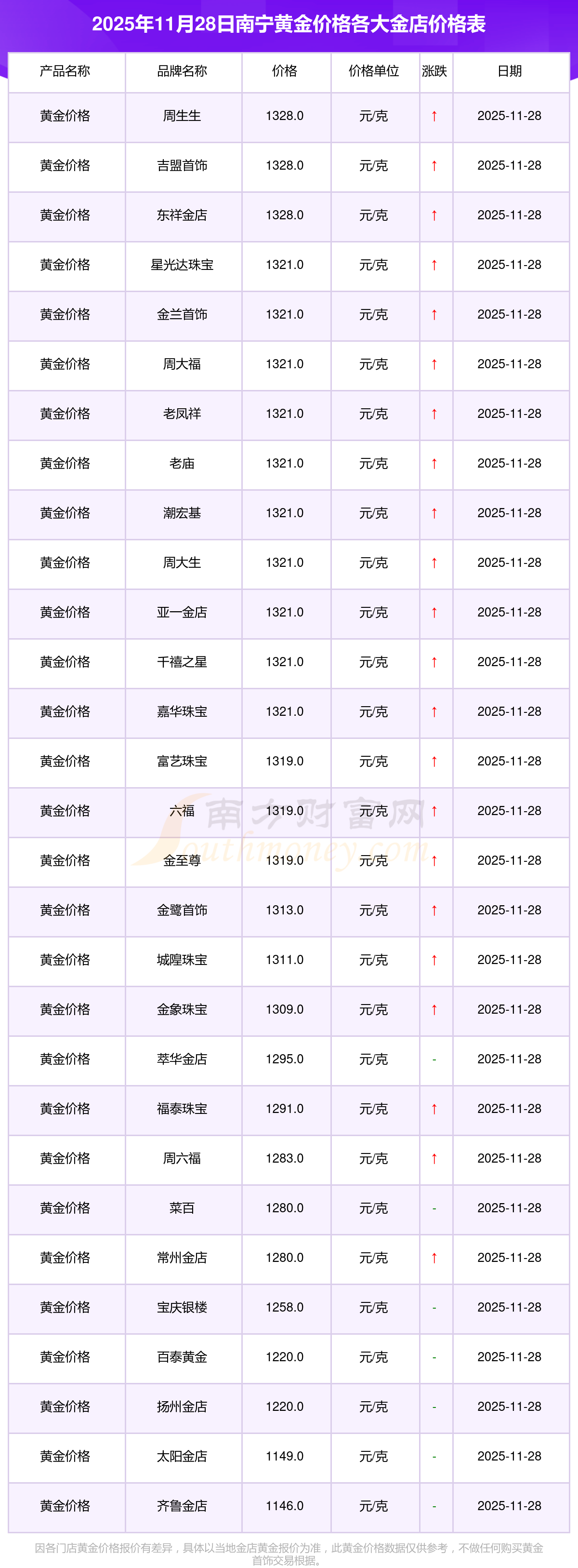 2025年11月28日南寧星光達(dá)珠寶、星光達(dá)珠寶、寶泉錢幣、金蘭首飾、金蘭首飾、謝瑞麟、謝瑞麟、謝瑞麟、謝瑞麟、謝瑞麟、金銀街等各大金店品牌黃金價(jià)格最新價(jià)格如下:星光達(dá)珠寶黃金價(jià)格1321.0元/克,星光達(dá)珠寶鉑金價(jià)格600.0元/克,寶泉錢幣銀條價(jià)格12.6元/克,金蘭首飾黃金價(jià)格1321.0元/克,金蘭首飾鉑金價(jià)格600.0元/克,謝瑞麟金條價(jià)格(內(nèi)地)1207.0元/克,謝瑞麟金飾價(jià)格(內(nèi)地)1321.0元/克,謝瑞麟黃金飾品(香港)46370.0,謝瑞麟鉑金飾品(香港)13970.0,謝瑞麟金條金價(jià)(香港)41860.0,金銀街投資金條1296.0元/克。