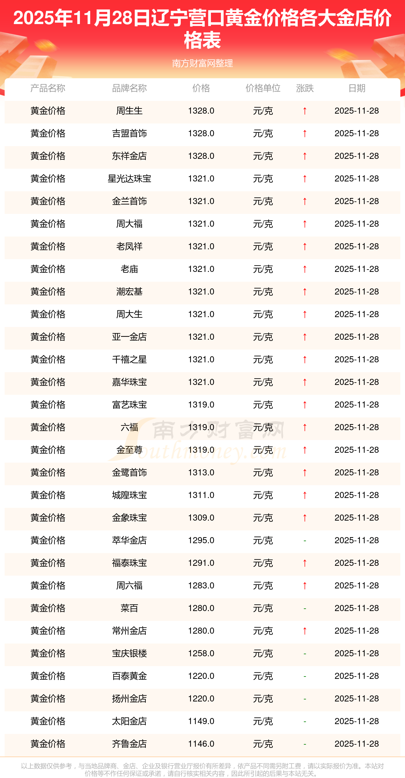 今天是2025年11月28日,遼寧營口星光達(dá)珠寶、星光達(dá)珠寶、寶泉錢幣、金蘭首飾、金蘭首飾、謝瑞麟、謝瑞麟、謝瑞麟、謝瑞麟、謝瑞麟、金銀街等各大金店品牌黃金價(jià)格最新價(jià)格行情是這樣的:星光達(dá)珠寶1321.0元/克、星光達(dá)珠寶600.0元/克、寶泉錢幣12.6元/克、金蘭首飾1321.0元/克、金蘭首飾600.0元/克、謝瑞麟1207.0元/克、謝瑞麟1321.0元/克、謝瑞麟46370.0、謝瑞麟13970.0、謝瑞麟41860.0、金銀街1296.0元/克。