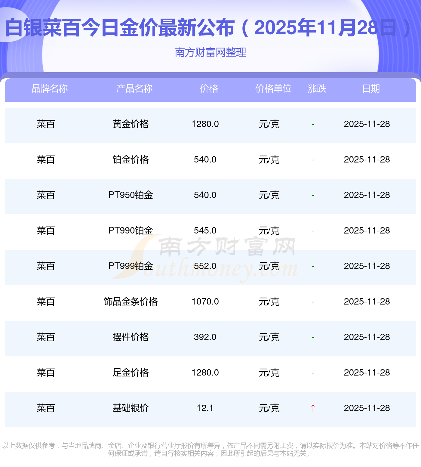 以上數(shù)據(jù)僅供參考,與當(dāng)?shù)仄放粕、金店、企業(yè)及銀行營(yíng)業(yè)廳報(bào)價(jià)有所差異,依產(chǎn)品不同需另附工費(fèi),請(qǐng)以實(shí)際報(bào)價(jià)為準(zhǔn)。本站對(duì)價(jià)格等不作任何保證或承諾,請(qǐng)自行核實(shí)相關(guān)內(nèi)容,因此所引起的后果與本站無關(guān)。