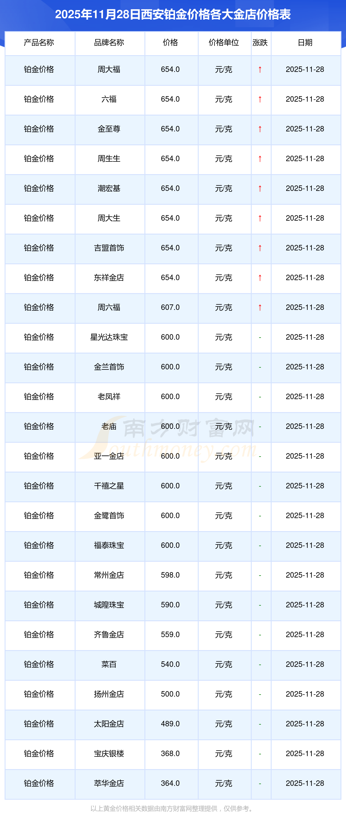西安各大金店鉑金價(jià)格多少錢一克?鉑金價(jià)格今日金價(jià)查詢表(2025年11月28日)