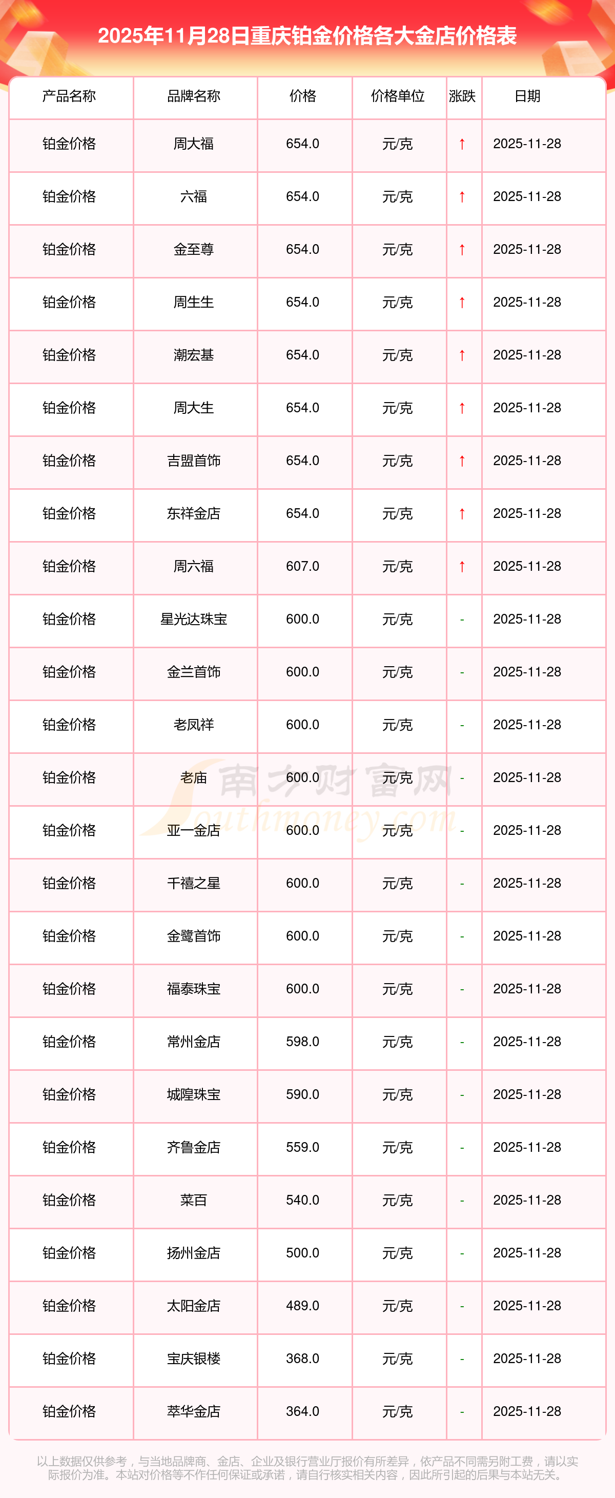 2025年11月28日,重慶星光達珠寶、星光達珠寶、寶泉錢幣、金蘭首飾、金蘭首飾、謝瑞麟、謝瑞麟、謝瑞麟、謝瑞麟、謝瑞麟、金銀街等各大金店品牌鉑金價格今日價格如下:星光達珠寶1321.0元/克、星光達珠寶600.0元/克、寶泉錢幣12.6元/克、金蘭首飾1321.0元/克、金蘭首飾600.0元/克、謝瑞麟1207.0元/克、謝瑞麟1321.0元/克、謝瑞麟46370.0、謝瑞麟13970.0、謝瑞麟41860.0、金銀街1296.0元/克。