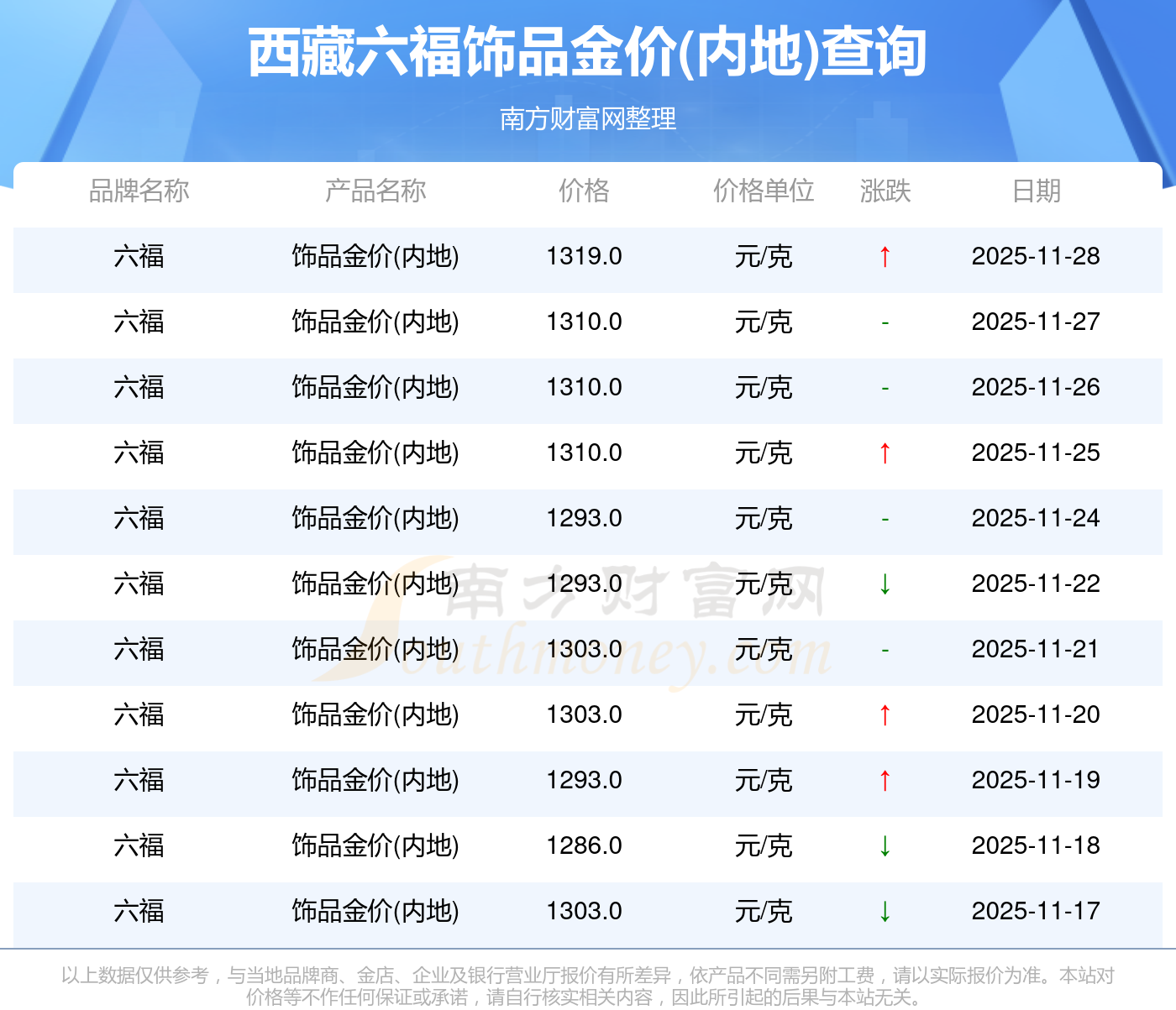 2025年11月29日星光達珠寶、星光達珠寶、寶泉錢幣、金蘭首飾、金蘭首飾、謝瑞麟、謝瑞麟、謝瑞麟、謝瑞麟、謝瑞麟、金銀街等各大金店品牌飾品金價(內(nèi)地)最新價格如下:星光達珠寶黃金價格1321.0元/克,星光達珠寶鉑金價格600.0元/克,寶泉錢幣銀條價格12.6元/克,金蘭首飾黃金價格1321.0元/克,金蘭首飾鉑金價格600.0元/克,謝瑞麟金條價格(內(nèi)地)1207.0元/克,謝瑞麟金飾價格(內(nèi)地)1321.0元/克,謝瑞麟黃金飾品(香港)46370.0,謝瑞麟鉑金飾品(香港)13970.0,謝瑞麟金條金價(香港)41860.0,金銀街投資金條1296.0元/克。