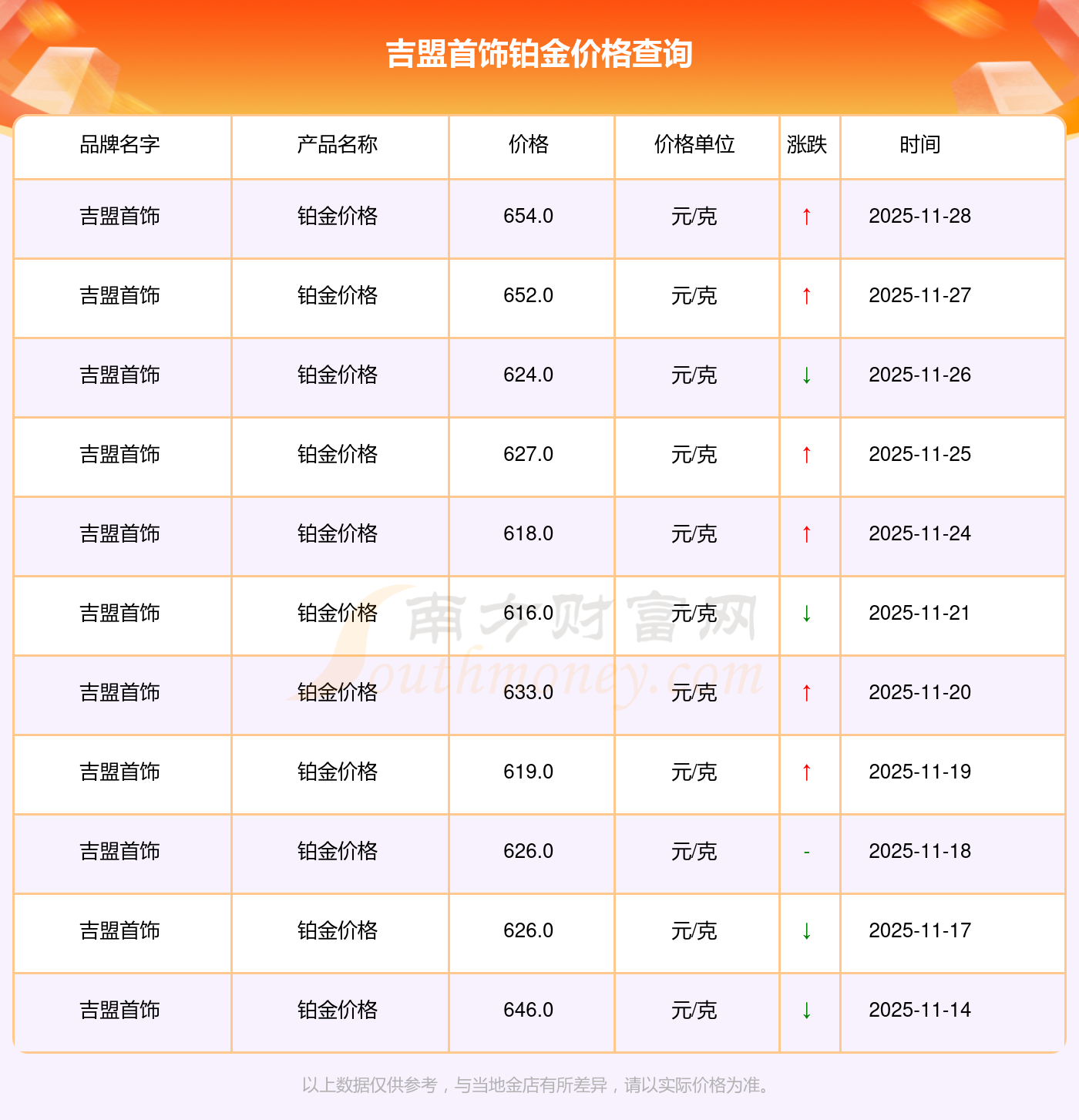 今日(2025年11月29日)吉盟首飾鉑金價(jià)格的價(jià)格為654.0元/克。