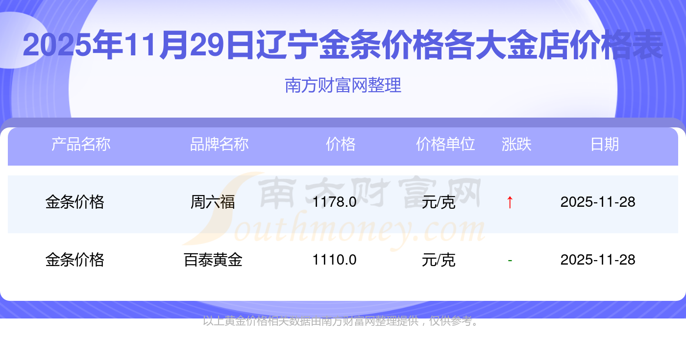 2025年11月29日遼寧各大金店金條價(jià)格最新價(jià)格查詢來(lái)了:星光達(dá)珠寶1321.0元/克,星光達(dá)珠寶600.0元/克,寶泉錢幣12.6元/克,金蘭首飾1321.0元/克,金蘭首飾600.0元/克,謝瑞麟1207.0元/克,謝瑞麟1321.0元/克,謝瑞麟46370.0,謝瑞麟13970.0,謝瑞麟41860.0,金銀街1296.0元/克。