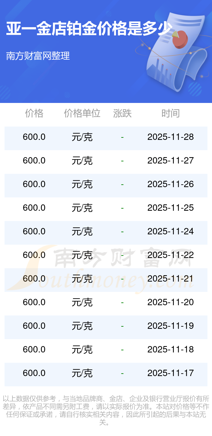 今日(2025年11月29日),亞一金店鉑金價(jià)格:600.0元/克。