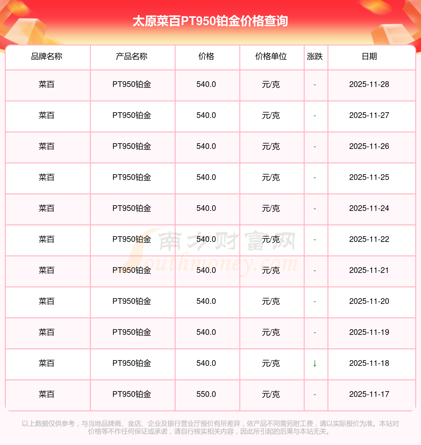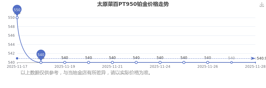 今日(2025年11月29日)太原菜百PT950鉑金最新價格為540.0元/克。