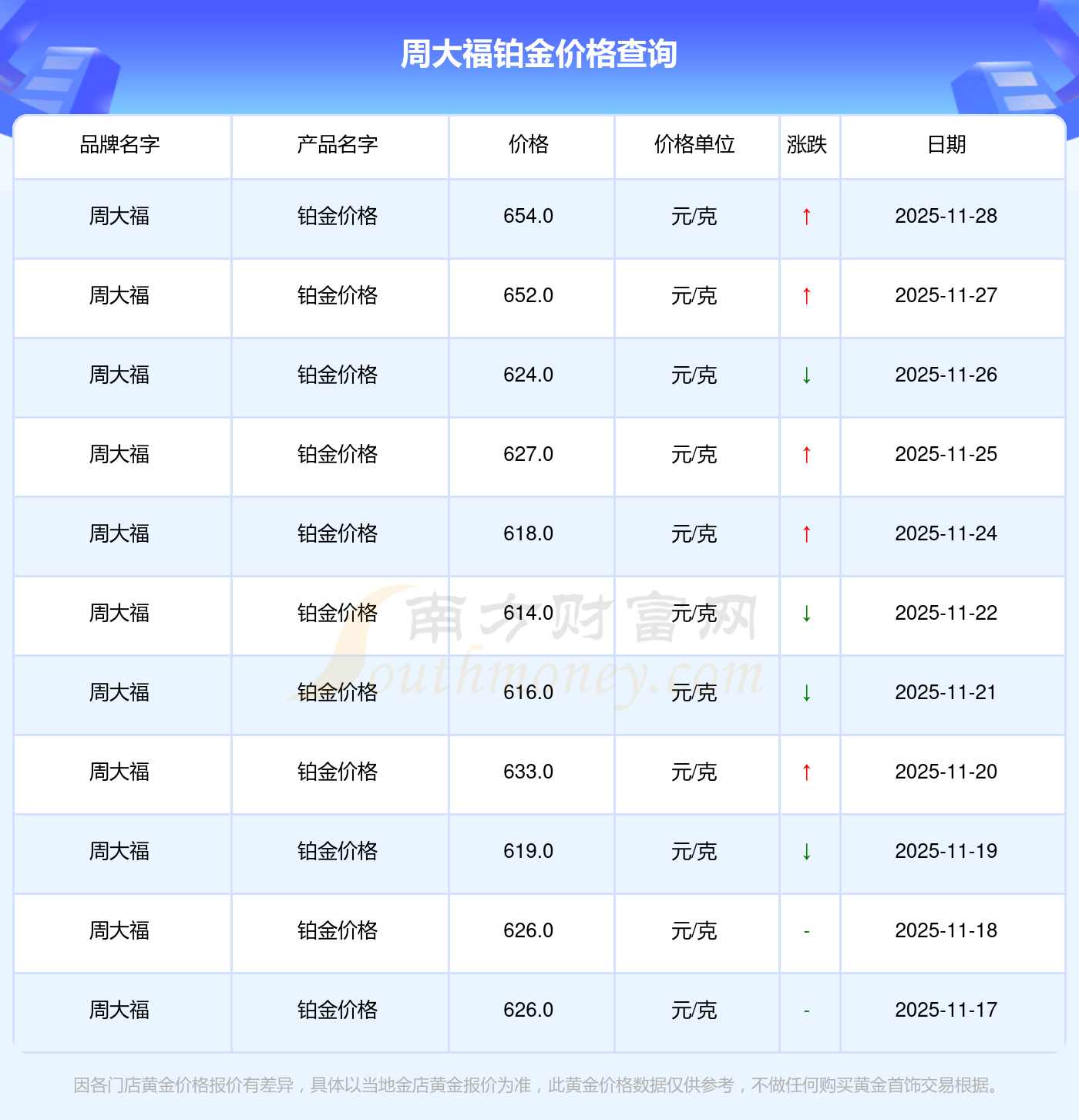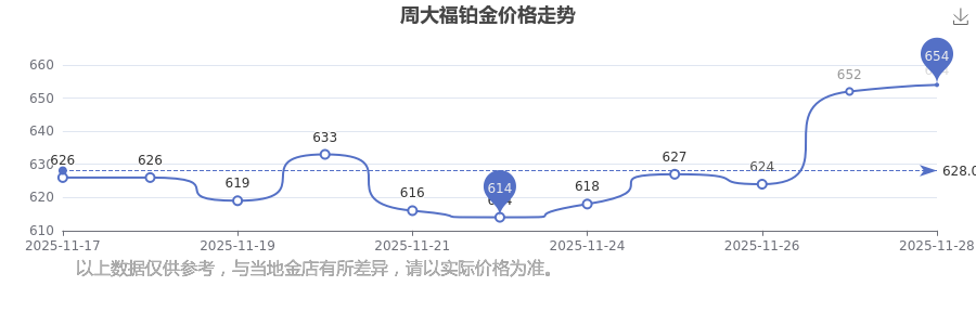目前周大福 鉑金價(jià)格的價(jià)格,今日最新為654.0元/克。