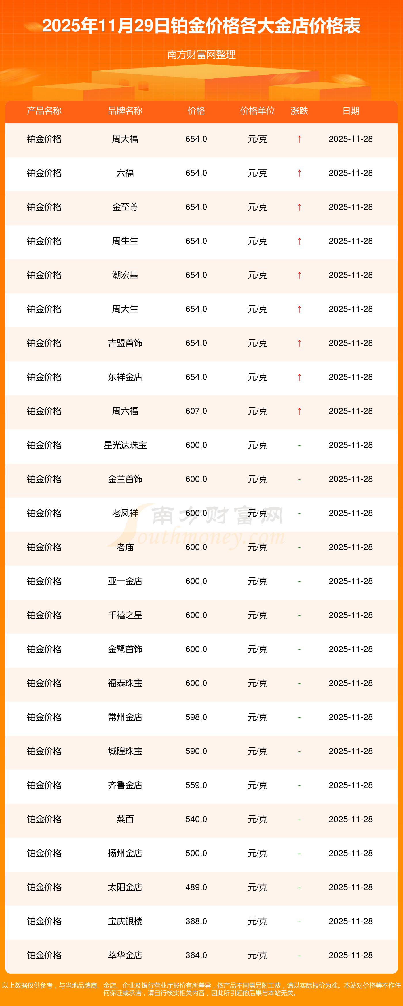 2025年11月29日,星光達(dá)珠寶、星光達(dá)珠寶、寶泉錢幣、金蘭首飾、金蘭首飾、謝瑞麟、謝瑞麟、謝瑞麟、謝瑞麟、謝瑞麟、金銀街等各大金店品牌鉑金價(jià)格今日價(jià)格如下:星光達(dá)珠寶1321.0元/克、星光達(dá)珠寶600.0元/克、寶泉錢幣12.6元/克、金蘭首飾1321.0元/克、金蘭首飾600.0元/克、謝瑞麟1207.0元/克、謝瑞麟1321.0元/克、謝瑞麟46370.0、謝瑞麟13970.0、謝瑞麟41860.0、金銀街1296.0元/克。