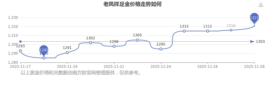 今日老鳳祥 足金價格最新的克重售價為1321.0元/克。