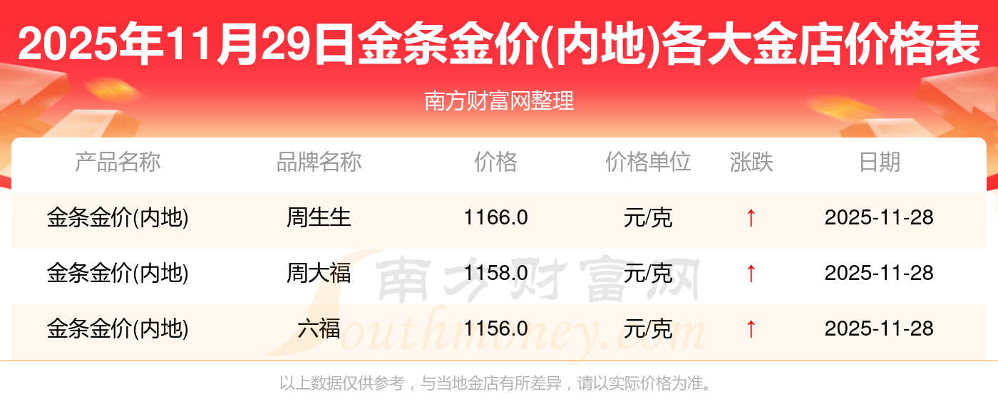 2025年11月29日,星光達珠寶、星光達珠寶、寶泉錢幣、金蘭首飾、金蘭首飾、謝瑞麟、謝瑞麟、謝瑞麟、謝瑞麟、謝瑞麟、金銀街等各大金店品牌金條金價(內地)今日價格如下:星光達珠寶1321.0元/克、星光達珠寶600.0元/克、寶泉錢幣12.6元/克、金蘭首飾1321.0元/克、金蘭首飾600.0元/克、謝瑞麟1207.0元/克、謝瑞麟1321.0元/克、謝瑞麟46370.0、謝瑞麟13970.0、謝瑞麟41860.0、金銀街1296.0元/克。