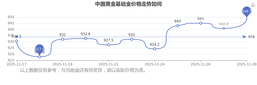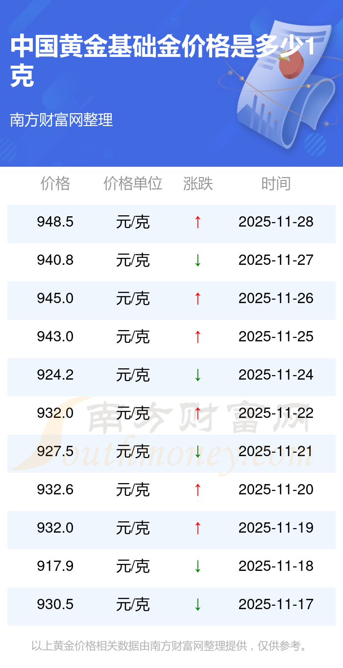 2025年11月29日中國黃金基礎(chǔ)金價格最新為948.5元/克。