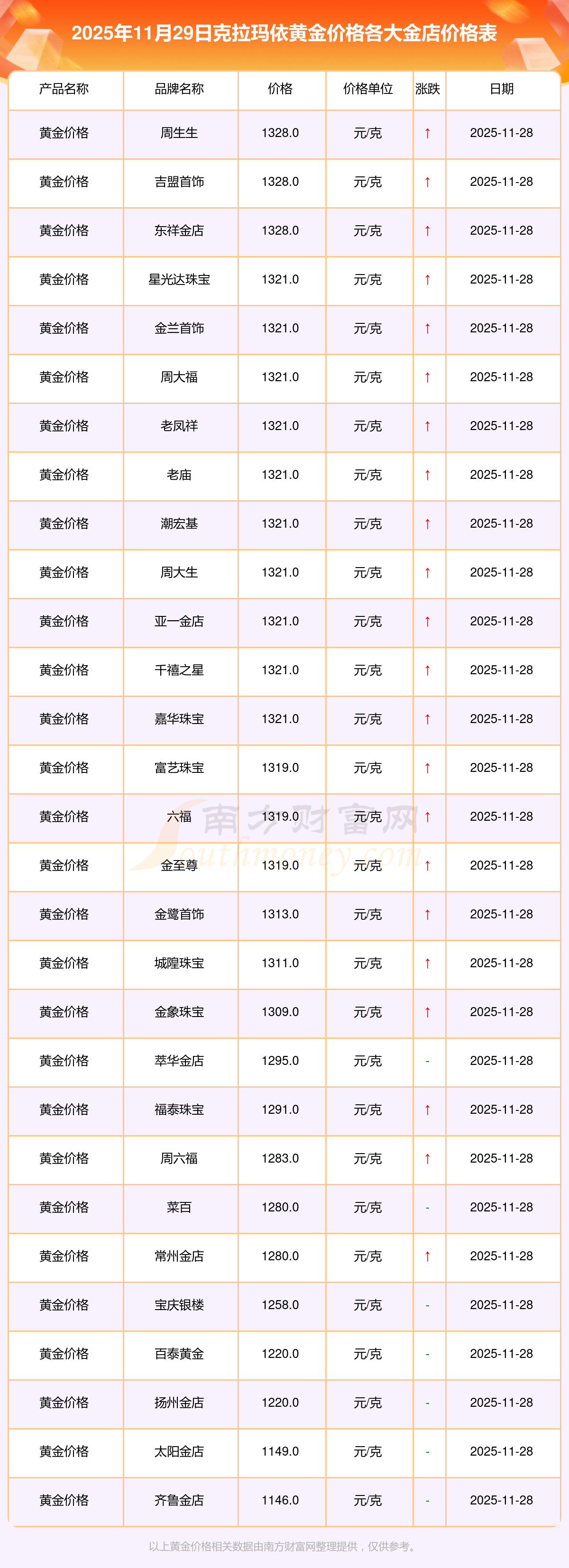 2025年11月29日,克拉瑪依星光達珠寶、星光達珠寶、寶泉錢幣、金蘭首飾、金蘭首飾、謝瑞麟、謝瑞麟、謝瑞麟、謝瑞麟、謝瑞麟、金銀街等各大金店品牌黃金價格今日價格如下:星光達珠寶1321.0元/克、星光達珠寶600.0元/克、寶泉錢幣12.6元/克、金蘭首飾1321.0元/克、金蘭首飾600.0元/克、謝瑞麟1207.0元/克、謝瑞麟1321.0元/克、謝瑞麟46370.0、謝瑞麟13970.0、謝瑞麟41860.0、金銀街1296.0元/克。