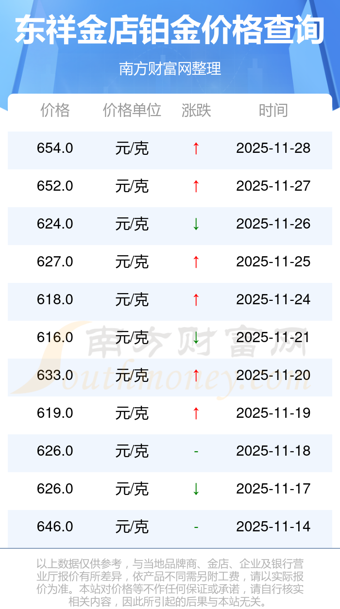 今日(2025年11月29日)東祥金店鉑金價格為654.0元/克。