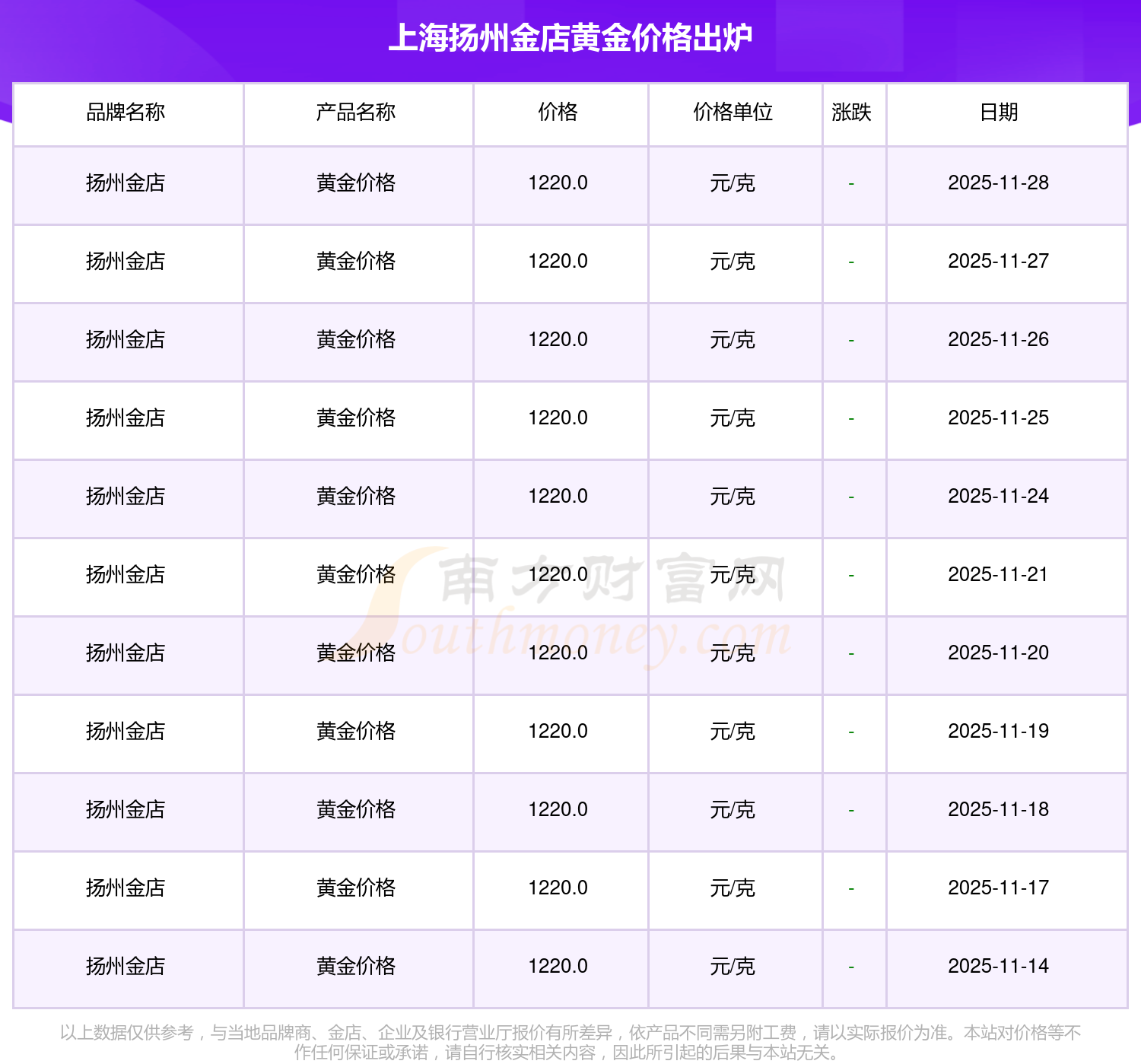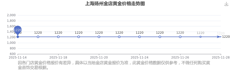 2025年11月29日上海揚州金店黃金價格:1220.0元/克。