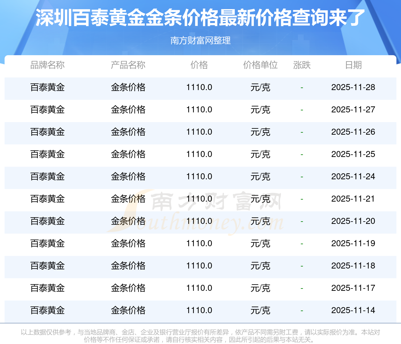 2025年11月29日各大金店金條價格最新價格:星光達珠寶1321.0元/克,星光達珠寶600.0元/克,寶泉錢幣12.6元/克,金蘭首飾1321.0元/克,金蘭首飾600.0元/克,謝瑞麟1207.0元/克,謝瑞麟1321.0元/克,謝瑞麟46370.0,謝瑞麟13970.0,謝瑞麟41860.0,金銀街1296.0元/克。