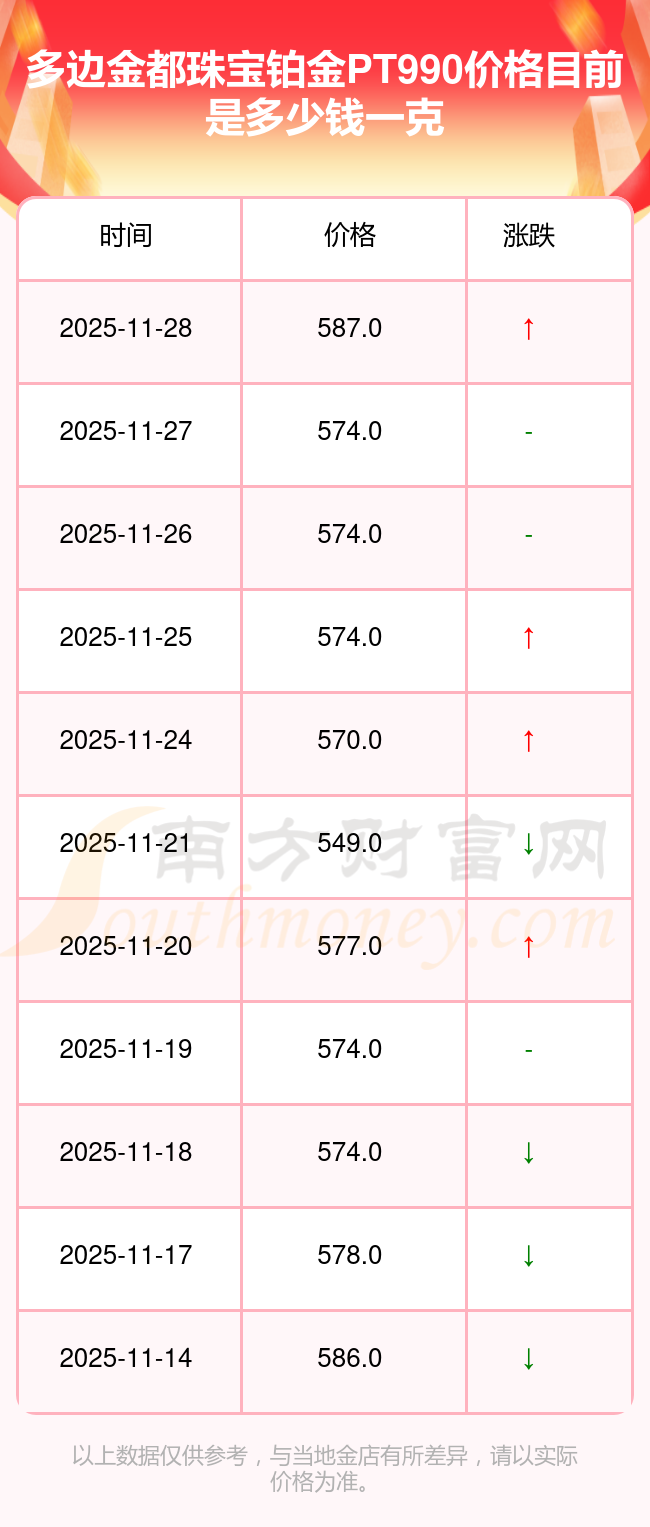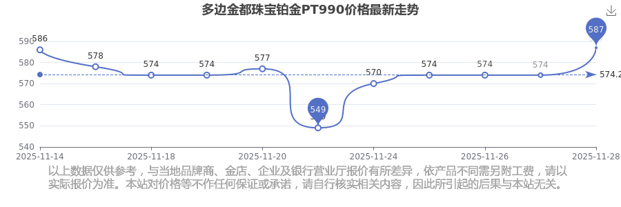 今日多邊金都珠寶鉑金PT990價(jià)格最新是587.0元/克。