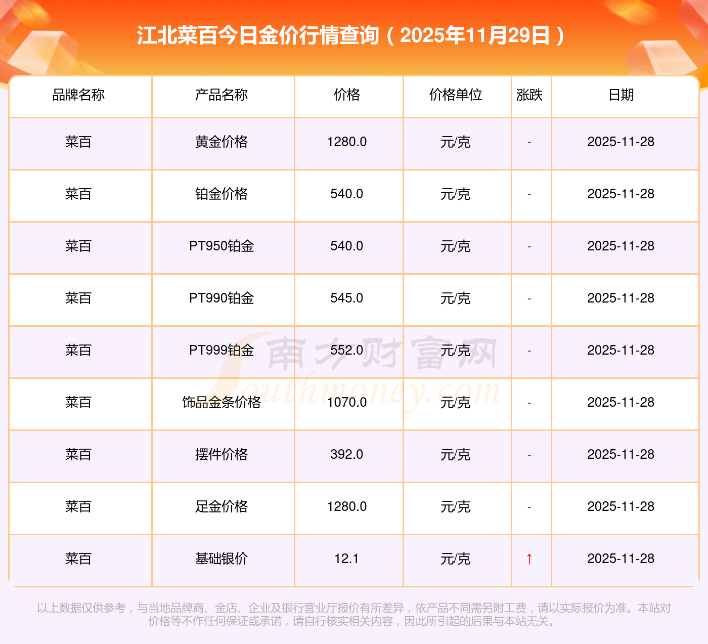 黃金價(jià)格1321.0元/克,鉑金價(jià)格600.0元/克,銀條價(jià)格12.6元/克,黃金價(jià)格1321.0元/克,鉑金價(jià)格600.0元/克,金條價(jià)格(內(nèi)地)1207.0元/克,金飾價(jià)格(內(nèi)地)1321.0元/克,黃金飾品(香港)46370.0,鉑金飾品(香港)13970.0,金條金價(jià)(香港)41860.0,投資金條1296.0元/克。