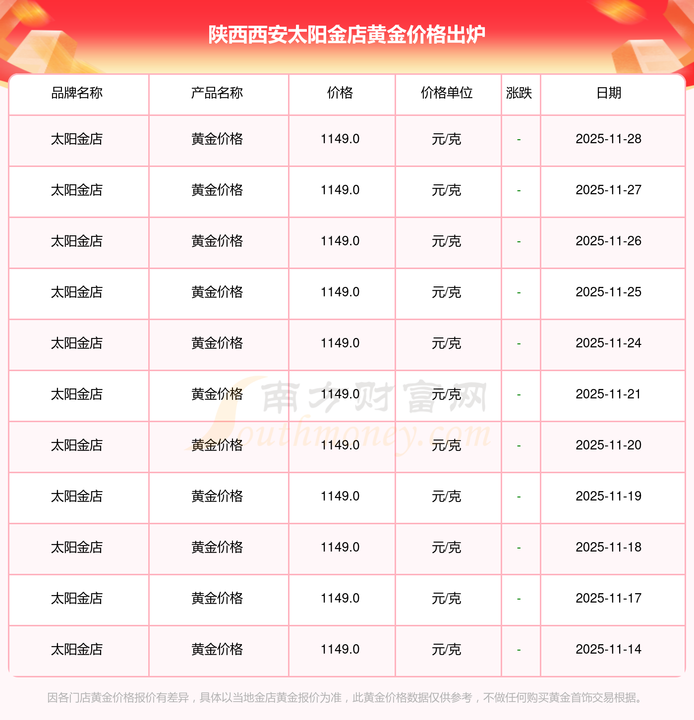 2025年11月29日,陜西西安太陽金店黃金價格每克的價值量定格在1149.0元/克。