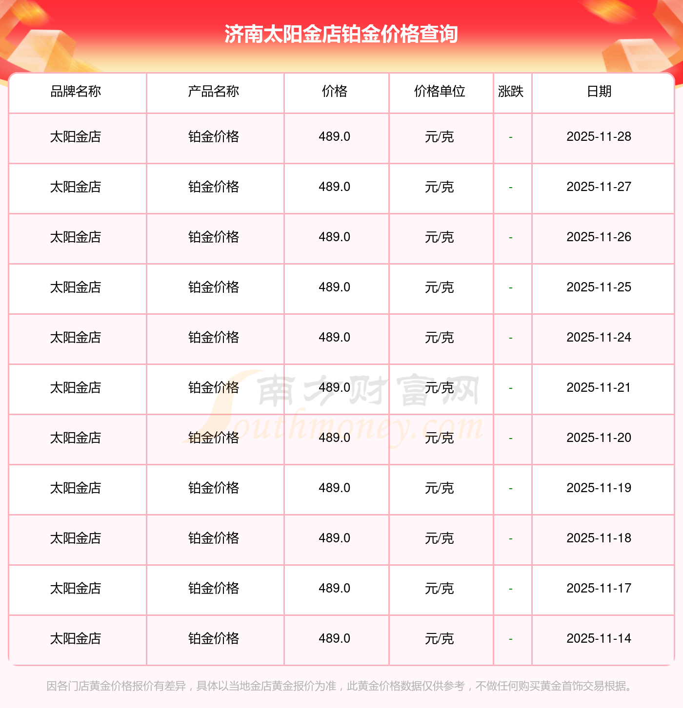 今天是2025年11月29日,星光達(dá)珠寶、星光達(dá)珠寶、寶泉錢幣、金蘭首飾、金蘭首飾、謝瑞麟、謝瑞麟、謝瑞麟、謝瑞麟、謝瑞麟、金銀街等各大金店品牌鉑金價(jià)格最新價(jià)格如下:星光達(dá)珠寶1321.0元/克、星光達(dá)珠寶600.0元/克、寶泉錢幣12.6元/克、金蘭首飾1321.0元/克、金蘭首飾600.0元/克、謝瑞麟1207.0元/克、謝瑞麟1321.0元/克、謝瑞麟46370.0、謝瑞麟13970.0、謝瑞麟41860.0、金銀街1296.0元/克。