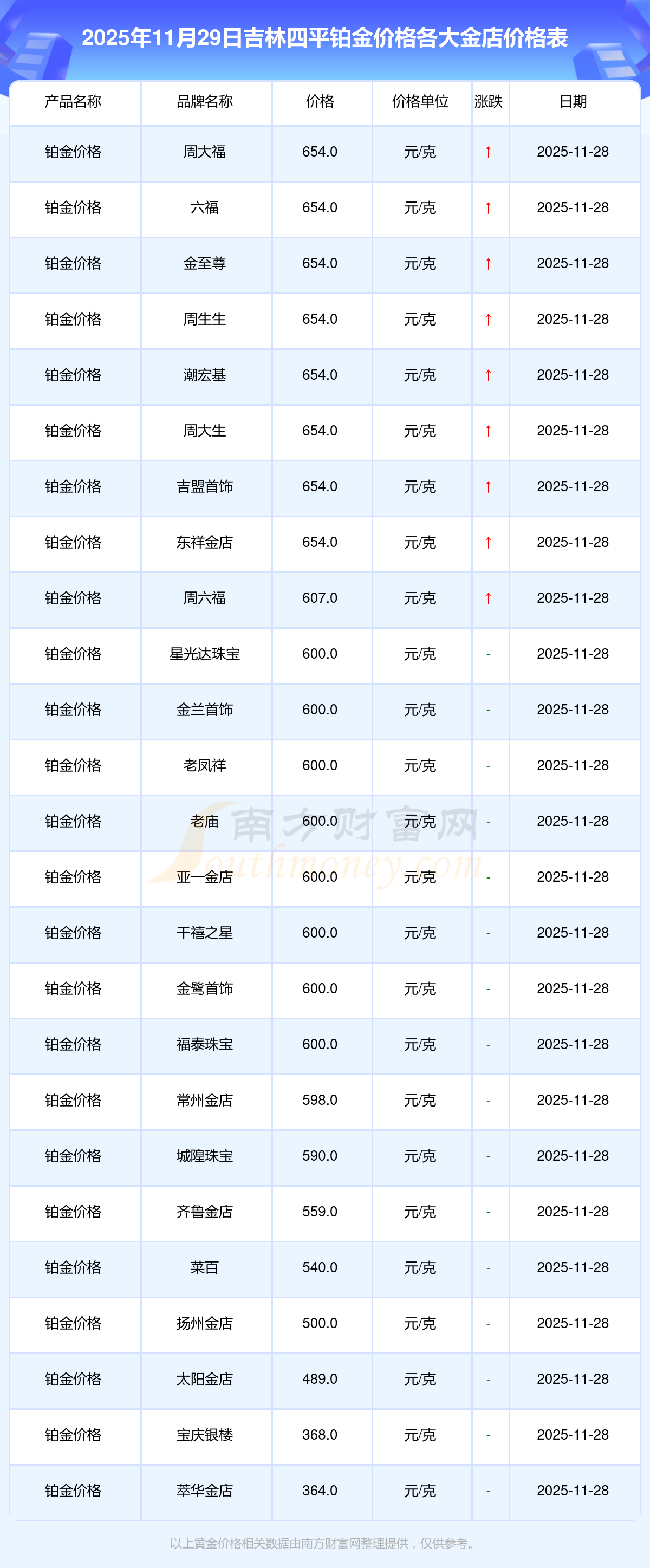 今日吉林四平鉑金價格報價最高的金店是周大福,為654.0元/克,報價最低的金店是萃華金店,為364.0元/克。今日鉑金價格高低差為290元/克。