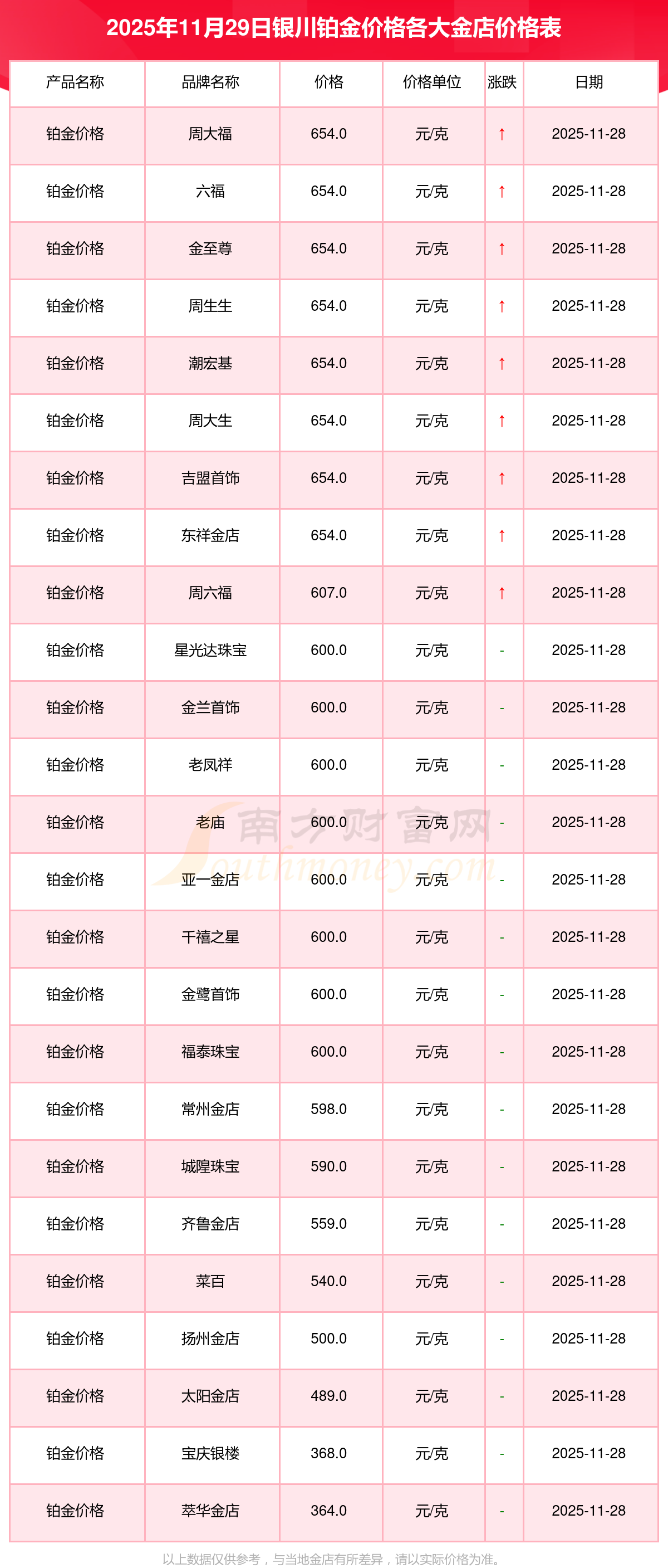 2025年11月29日銀川各金店鉑金價格是怎么樣的?銀川各金店鉑金價格查詢