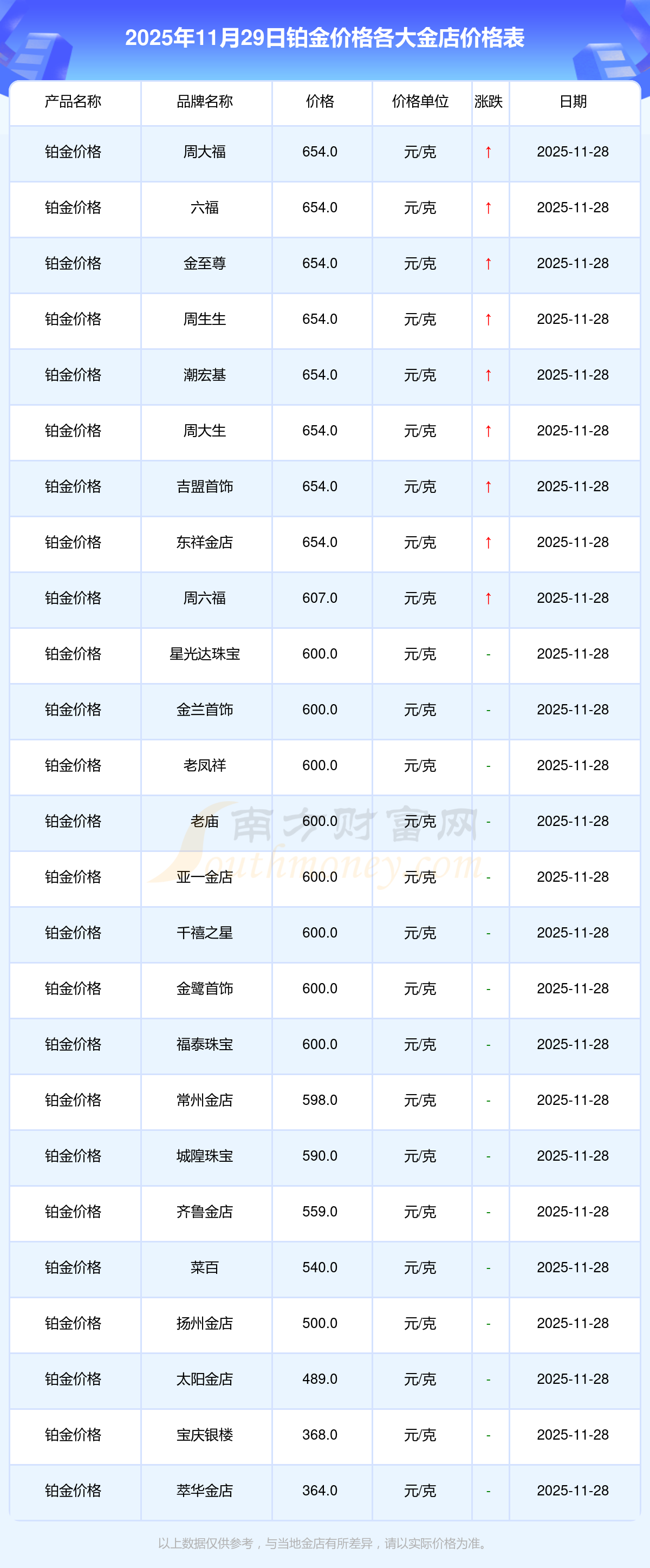 2025年11月29日星光達珠寶、星光達珠寶、寶泉錢幣、金蘭首飾、金蘭首飾、謝瑞麟、謝瑞麟、謝瑞麟、謝瑞麟、謝瑞麟、金銀街等各大金店品牌鉑金價格最新價格如下:星光達珠寶黃金價格1321.0元/克,星光達珠寶鉑金價格600.0元/克,寶泉錢幣銀條價格12.6元/克,金蘭首飾黃金價格1321.0元/克,金蘭首飾鉑金價格600.0元/克,謝瑞麟金條價格(內地)1207.0元/克,謝瑞麟金飾價格(內地)1321.0元/克,謝瑞麟黃金飾品(香港)46370.0,謝瑞麟鉑金飾品(香港)13970.0,謝瑞麟金條金價(香港)41860.0,金銀街投資金條1296.0元/克。