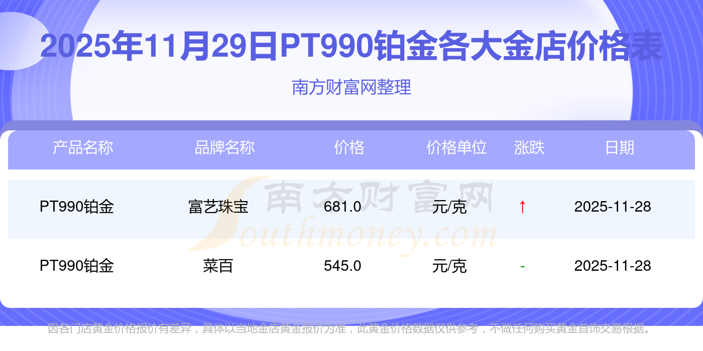 2025年11月29日各大金店P(guān)T990鉑金最新價格:星光達(dá)珠寶1321.0元/克,星光達(dá)珠寶600.0元/克,寶泉錢幣12.6元/克,金蘭首飾1321.0元/克,金蘭首飾600.0元/克,謝瑞麟1207.0元/克,謝瑞麟1321.0元/克,謝瑞麟46370.0,謝瑞麟13970.0,謝瑞麟41860.0,金銀街1296.0元/克。