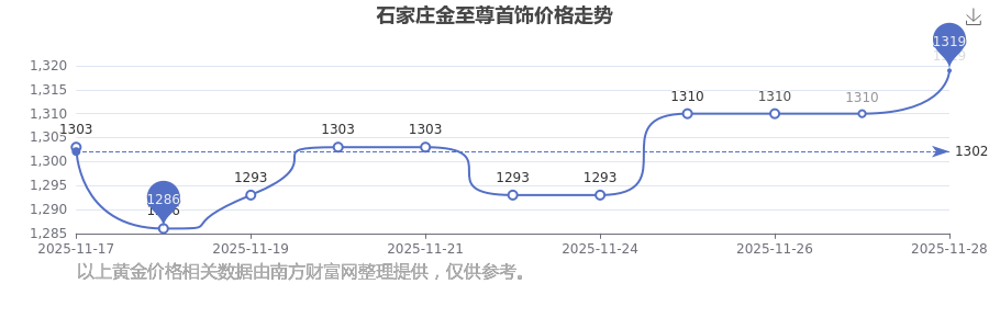 今日(2025年11月29日),石家莊金至尊首飾的定價為 1319.0元/克。