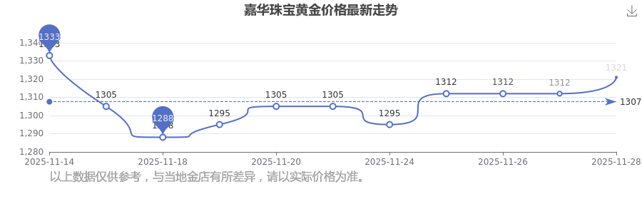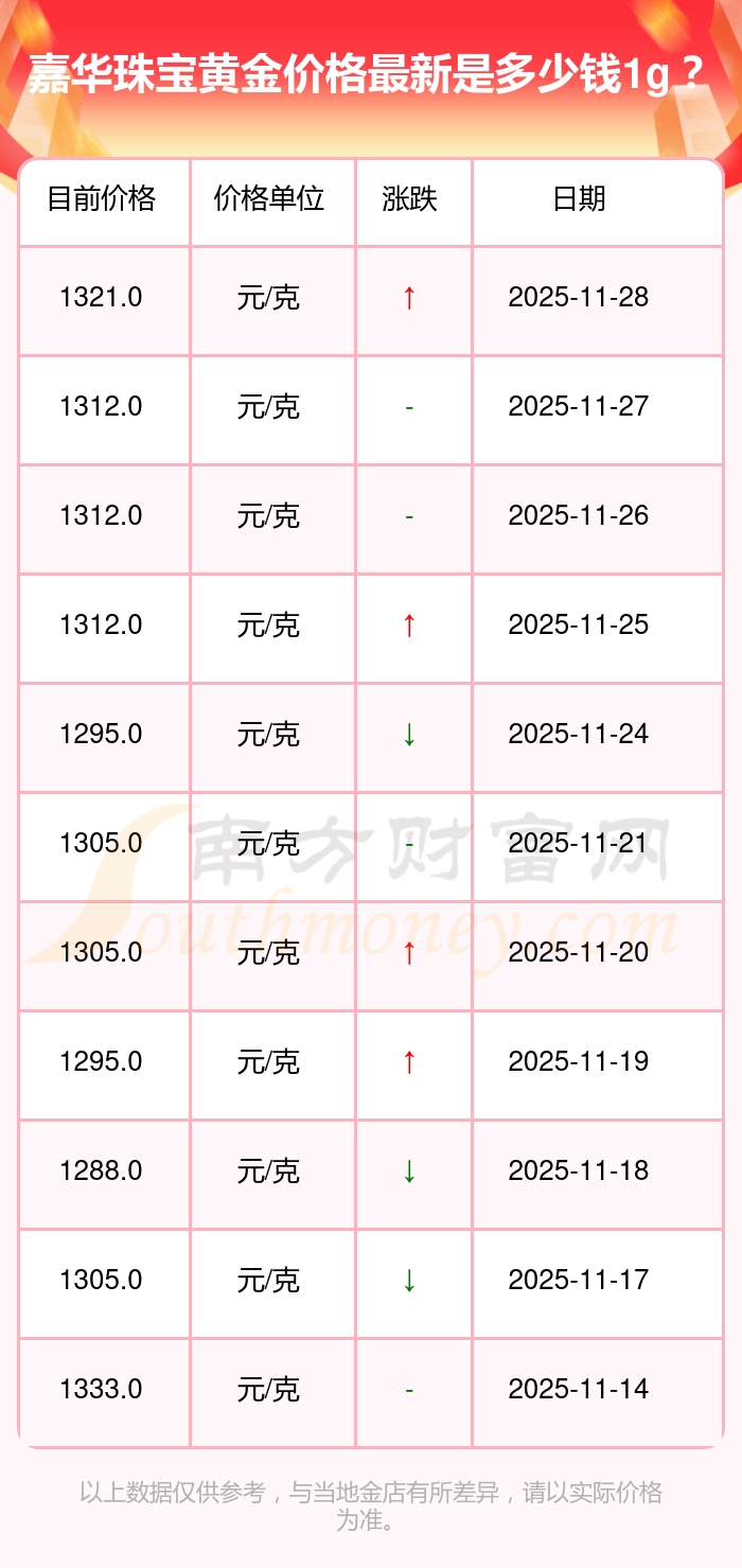 想知道當下黃金價格,今天黃金一克賣多少錢呢?黃金價格一般是多少錢一克?今日嘉華珠寶黃金價格最新價格為1321.0元/克。