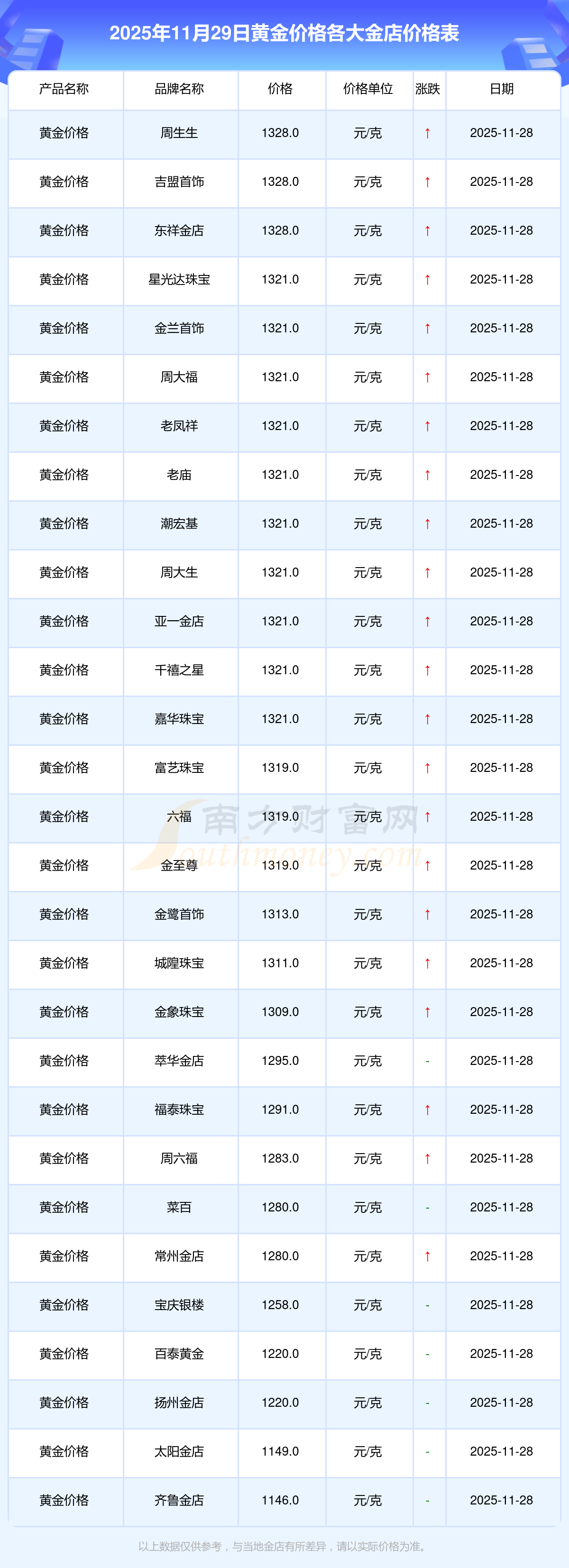2025年11月29日,星光達(dá)珠寶、星光達(dá)珠寶、寶泉錢幣、金蘭首飾、金蘭首飾、謝瑞麟、謝瑞麟、謝瑞麟、謝瑞麟、謝瑞麟、金銀街等各大金店品牌黃金價(jià)格今日價(jià)格如下:星光達(dá)珠寶1321.0元/克、星光達(dá)珠寶600.0元/克、寶泉錢幣12.6元/克、金蘭首飾1321.0元/克、金蘭首飾600.0元/克、謝瑞麟1207.0元/克、謝瑞麟1321.0元/克、謝瑞麟46370.0、謝瑞麟13970.0、謝瑞麟41860.0、金銀街1296.0元/克。